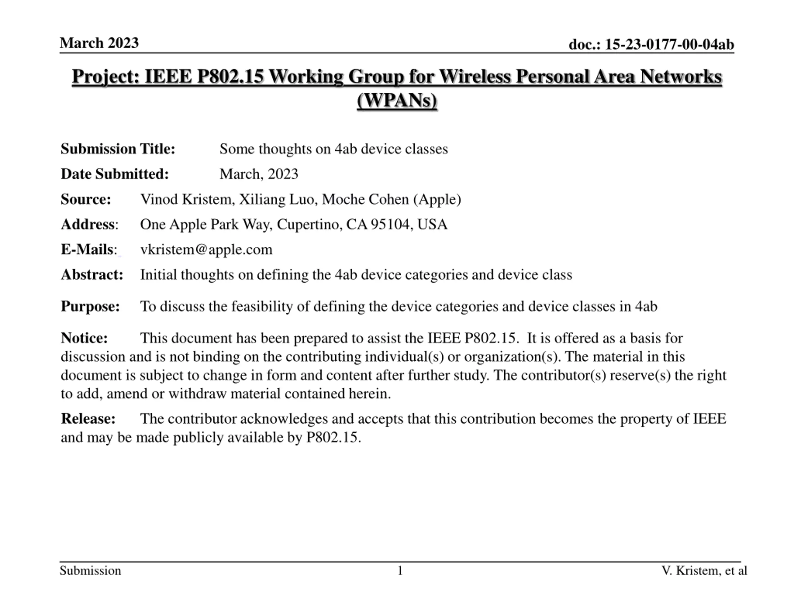 March 2023 doc.: 15-23-0177-00-04ab Project: IEEE P802.15 Working Group for Wireless Personal Area Networks (WPANs) Submission Title: Date Submitted: Source: Address: E-Mails: Abstract: Initial thoughts on defining the 4ab device categories and device class Some thoughts on 4ab device classes March, 2023 Vinod Kristem, Xiliang Luo, Moche Cohen (Apple) One Apple Park Way, Cupertino, CA 95104, USA vkristem@apple.com Purpose: To discuss the feasibility of defining the device categories and device classes in 4ab Notice: discussion and is not binding on the contributing individual(s) or organization(s). The material in this document is subject to change in form and content after further study. The contributor(s) reserve(s) the right to add, amend or withdraw material contained herein. Release: The contributor acknowledges and accepts that this contribution becomes the property of IEEE and may be made publicly available by P802.15. This document has been prepared to assist the IEEE P802.15. It is offered as a basis for Submission 1 V. Kristem, et al