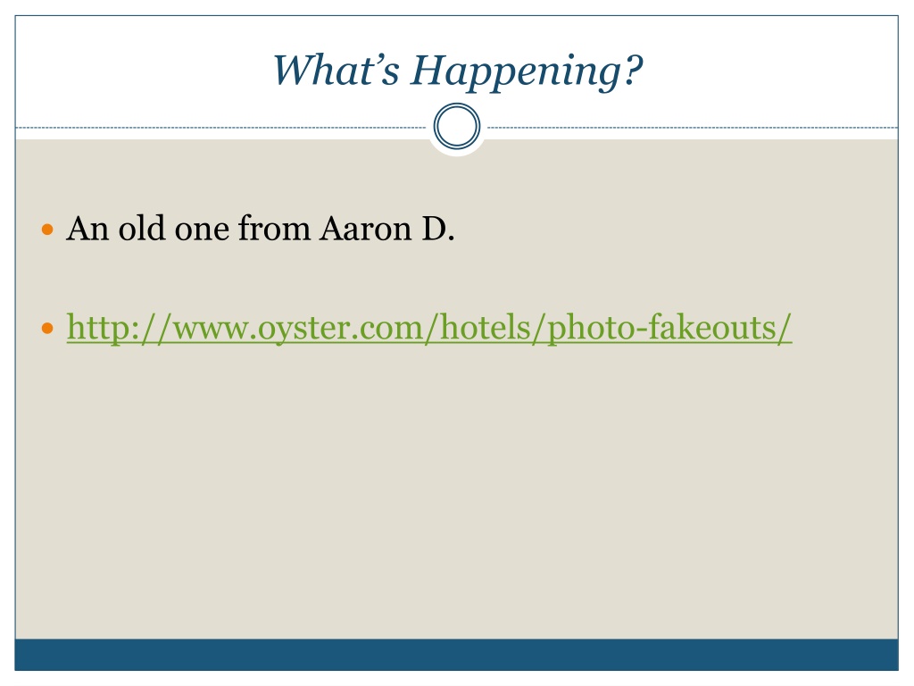 Whats Happening? An old one from Aaron D. http://www.oyster.com/hotels/photo-fakeouts/