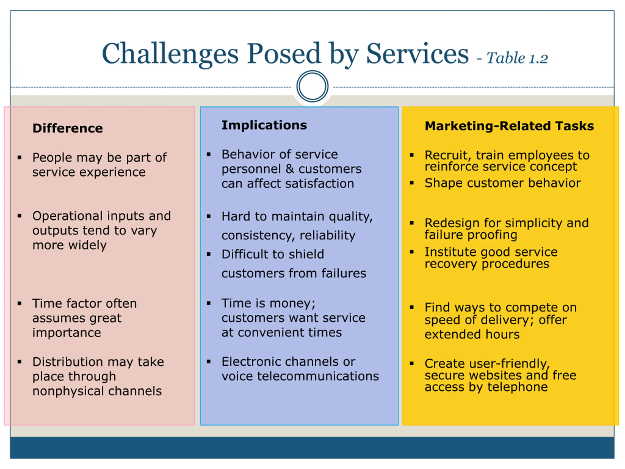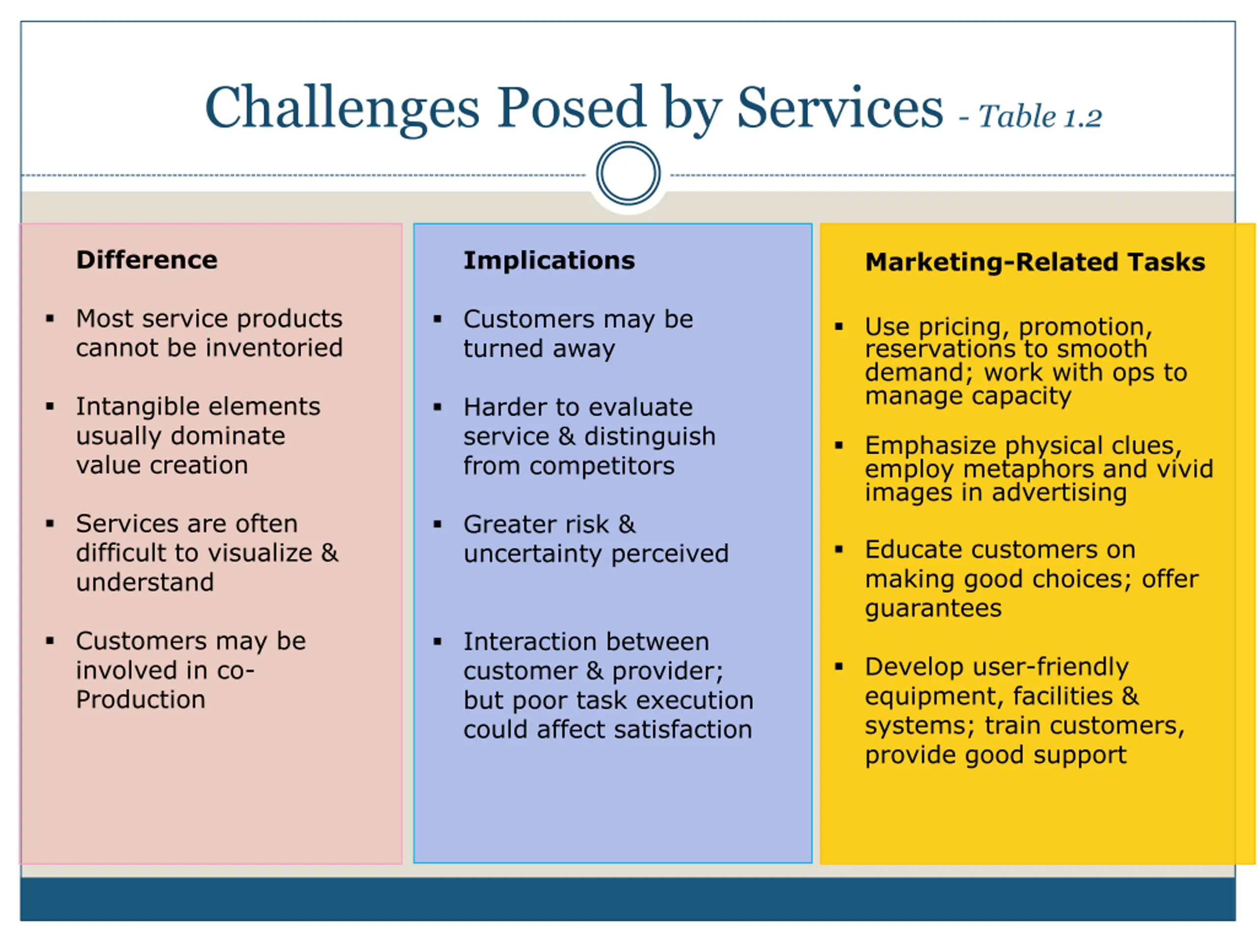 Challenges Posed by Services - Table 1.2 Implications Marketing-Related Tasks Difference Behavior of service personnel & customers can affect satisfaction Recruit, train employees to reinforce service concept Shape customer behavior People may be part of service experience Operational inputs and outputs tend to vary more widely Hard to maintain quality, consistency, reliability Difficult to shield customers from failures Redesign for simplicity and failure proofing Institute good service recovery procedures Time is money; customers want service at convenient times Time factor often assumes great importance Find ways to compete on speed of delivery; offer extended hours Electronic channels or voice telecommunications Distribution may take place through nonphysical channels Create user-friendly, secure websites and free access by telephone
