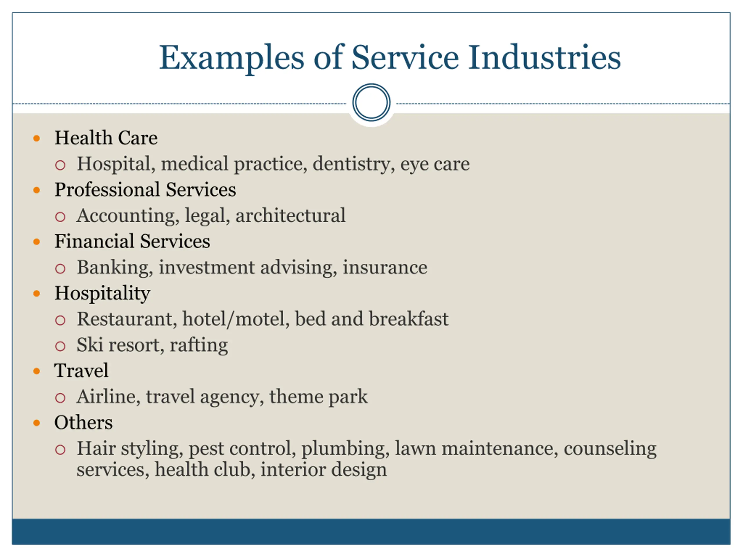 Examples of Service Industries Health Care Hospital, medical practice, dentistry, eye care Professional Services Accounting, legal, architectural Financial Services Banking, investment advising, insurance Hospitality Restaurant, hotel/motel, bed and breakfast Ski resort, rafting Travel Airline, travel agency, theme park Others Hair styling, pest control, plumbing, lawn maintenance, counseling services, health club, interior design