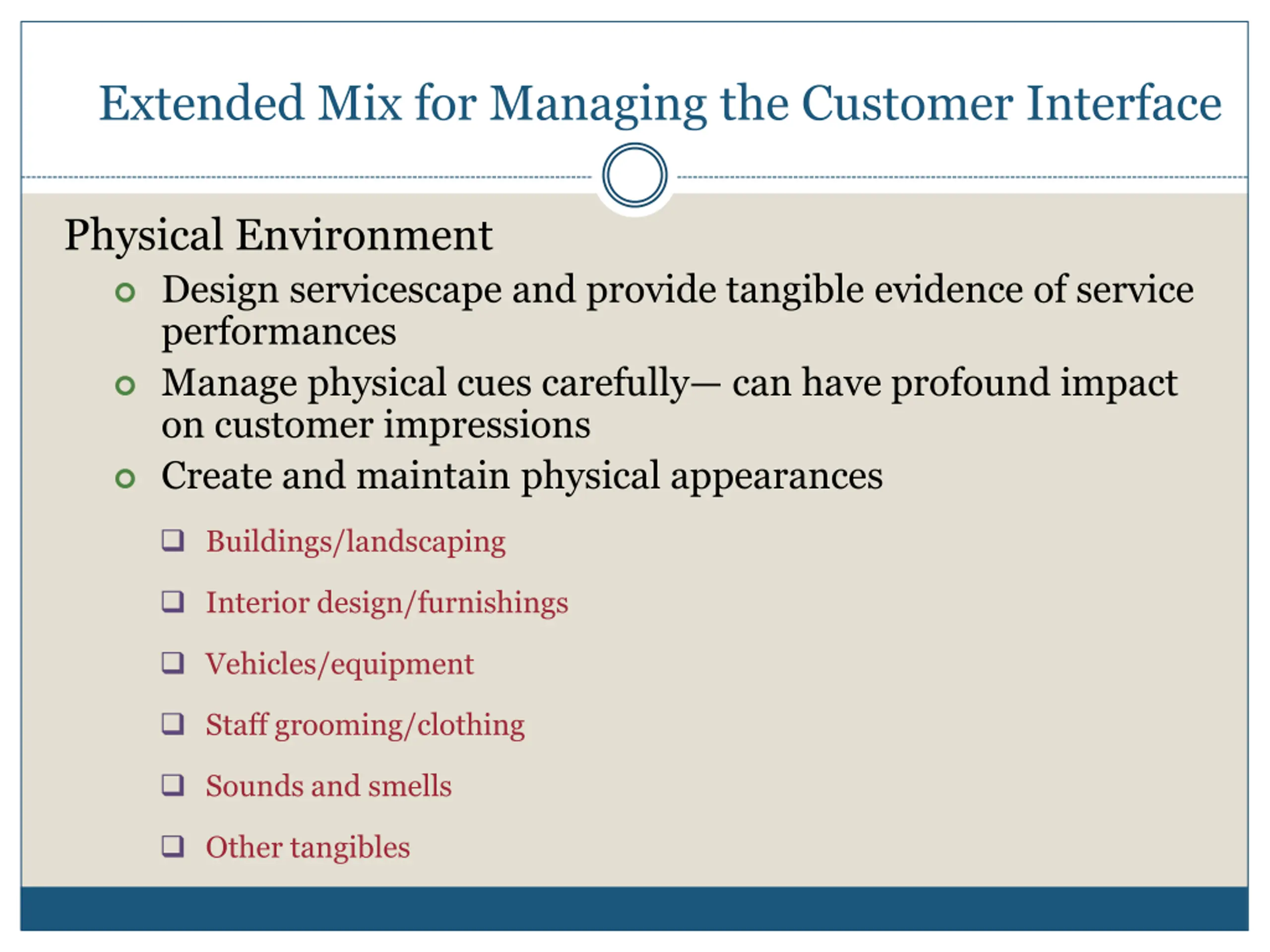 Extended Mix for Managing the Customer Interface Physical Environment Design servicescape and provide tangible evidence of service performances Manage physical cues carefully can have profound impact on customer impressions Create and maintain physical appearances Buildings/landscaping Interior design/furnishings Vehicles/equipment Staff grooming/clothing Sounds and smells Other tangibles