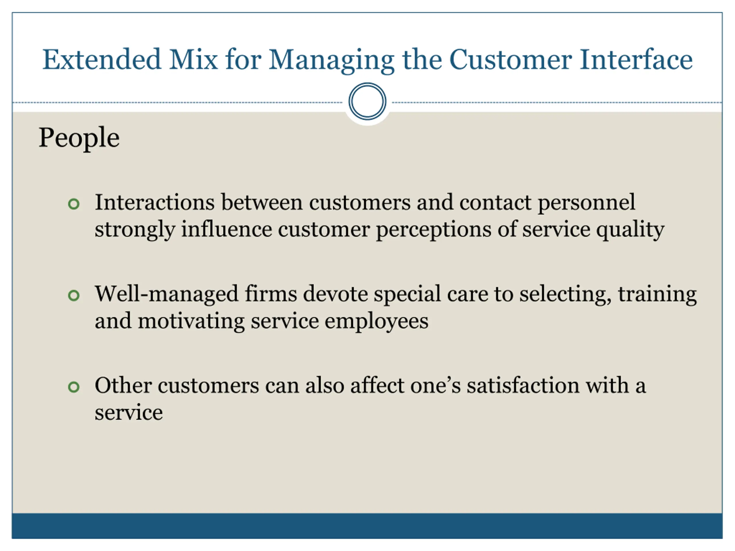 Extended Mix for Managing the Customer Interface People Interactions between customers and contact personnel strongly influence customer perceptions of service quality Well-managed firms devote special care to selecting, training and motivating service employees Other customers can also affect one s satisfaction with a service