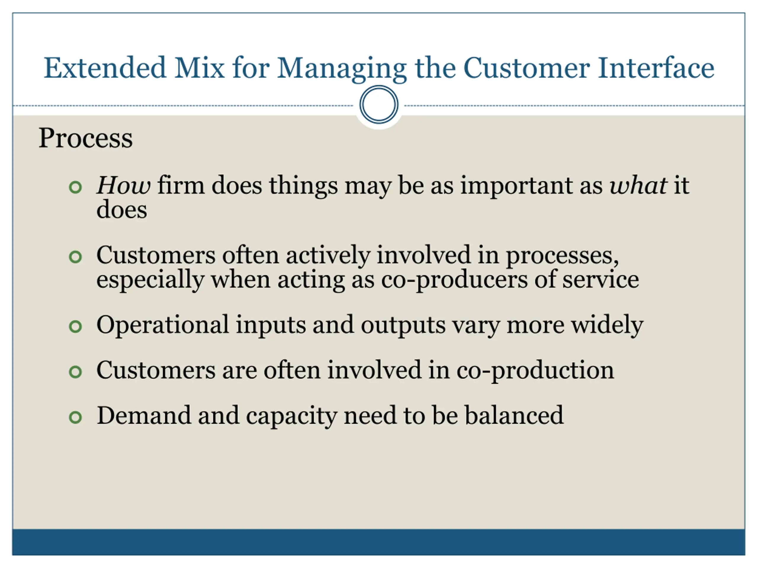 Extended Mix for Managing the Customer Interface Process How firm does things may be as important as what it does Customers often actively involved in processes, especially when acting as co-producers of service Operational inputs and outputs vary more widely Customers are often involved in co-production Demand and capacity need to be balanced