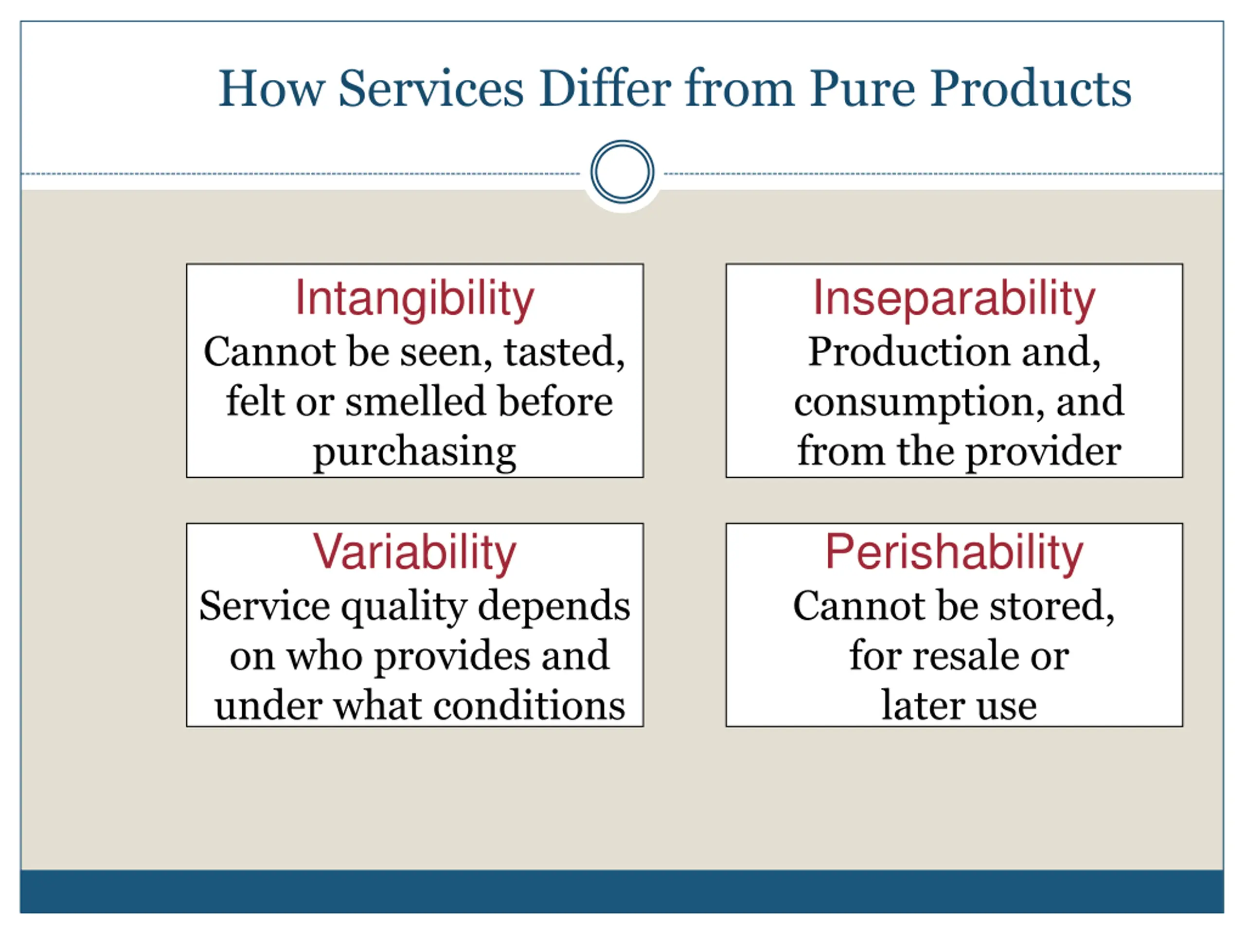 How Services Differ from Pure Products Intangibility Cannot be seen, tasted, felt or smelled before purchasing Inseparability Production and, consumption, and from the provider Variability Perishability Cannot be stored, for resale or later use Service quality depends on who provides and under what conditions
