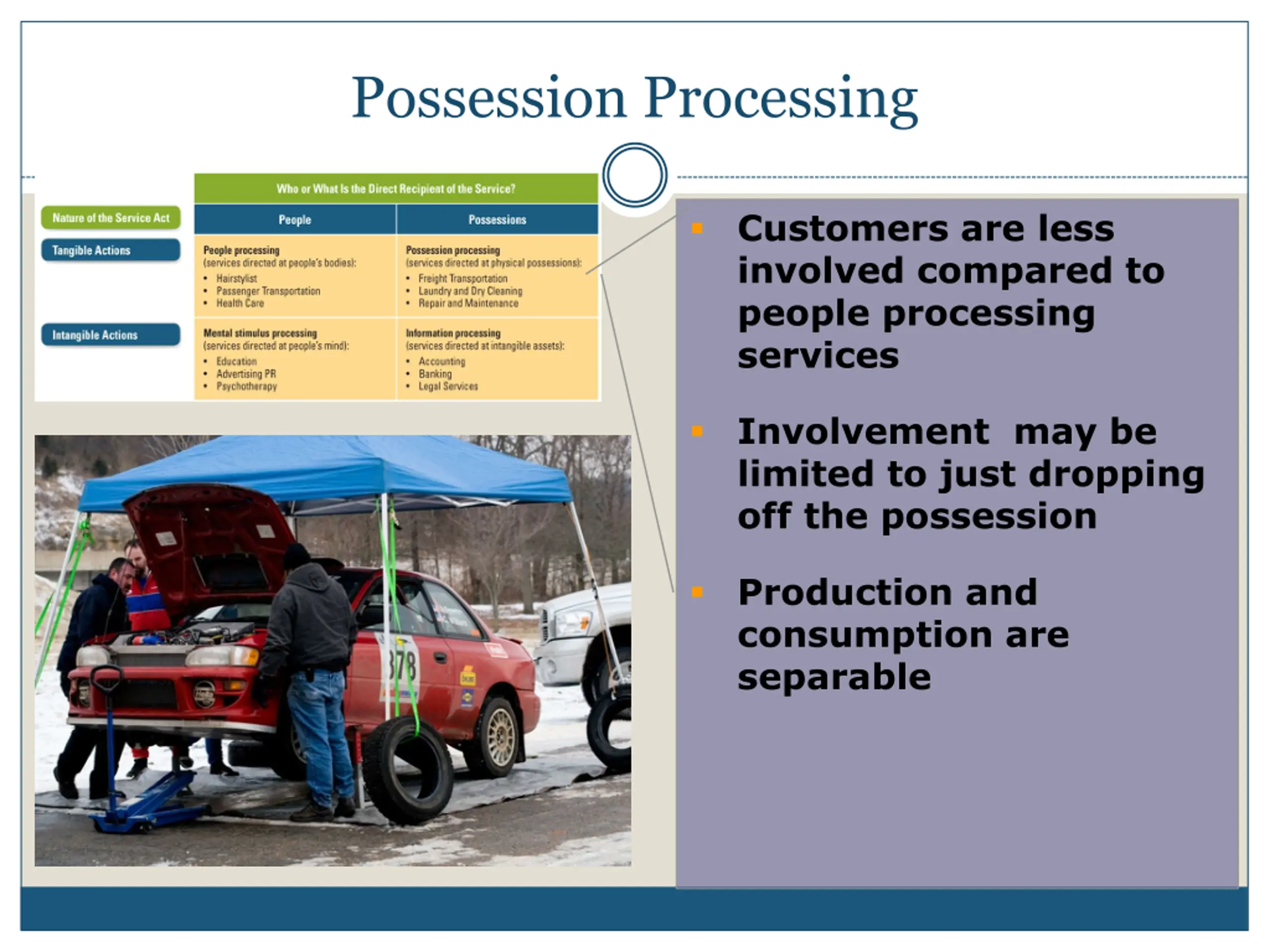 Possession Processing Customers are less involved compared to people processing services Involvement may be limited to just dropping off the possession Production and consumption are separable