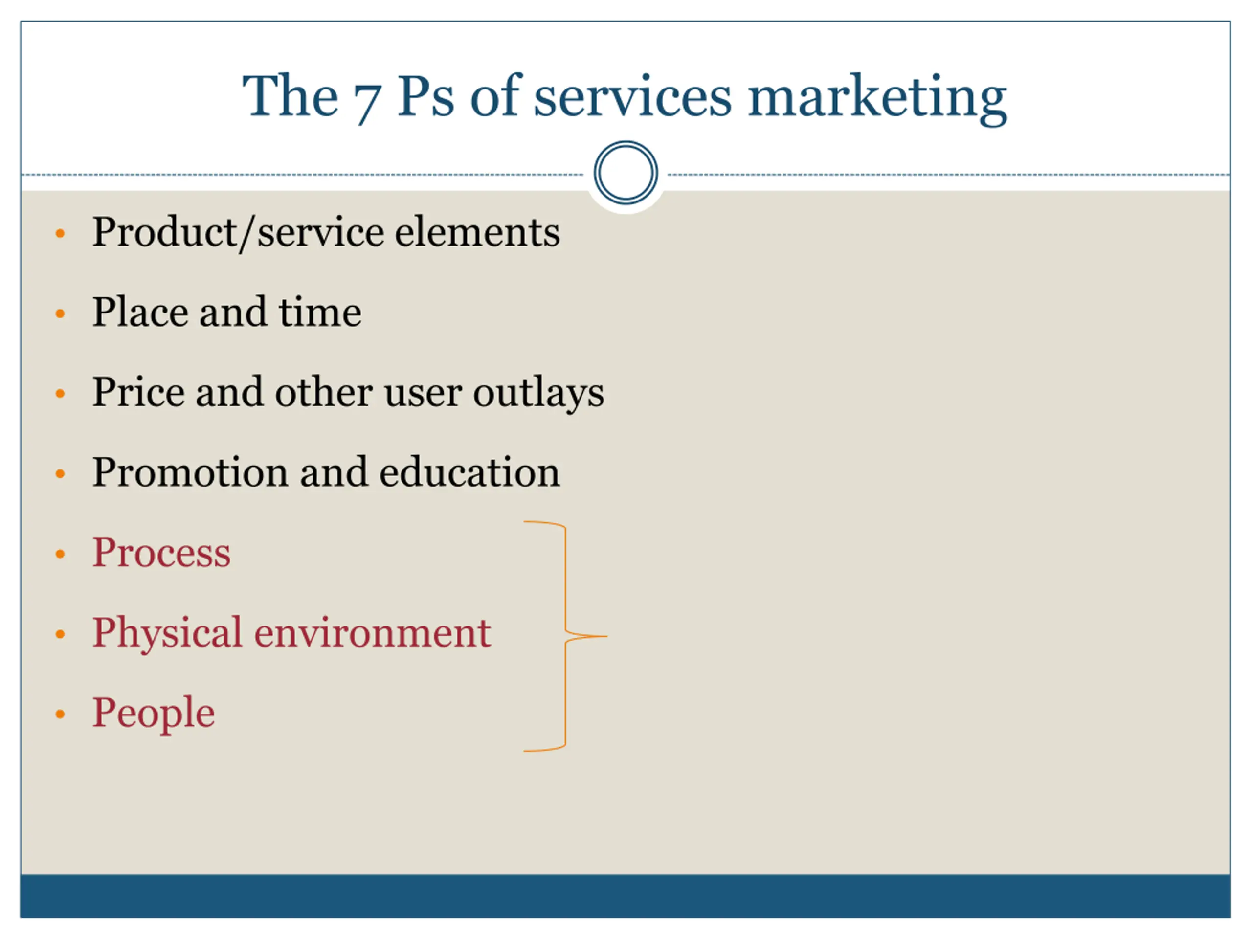 The 7 Ps of services marketing Product/service elements Place and time Price and other user outlays Promotion and education Process Physical environment People