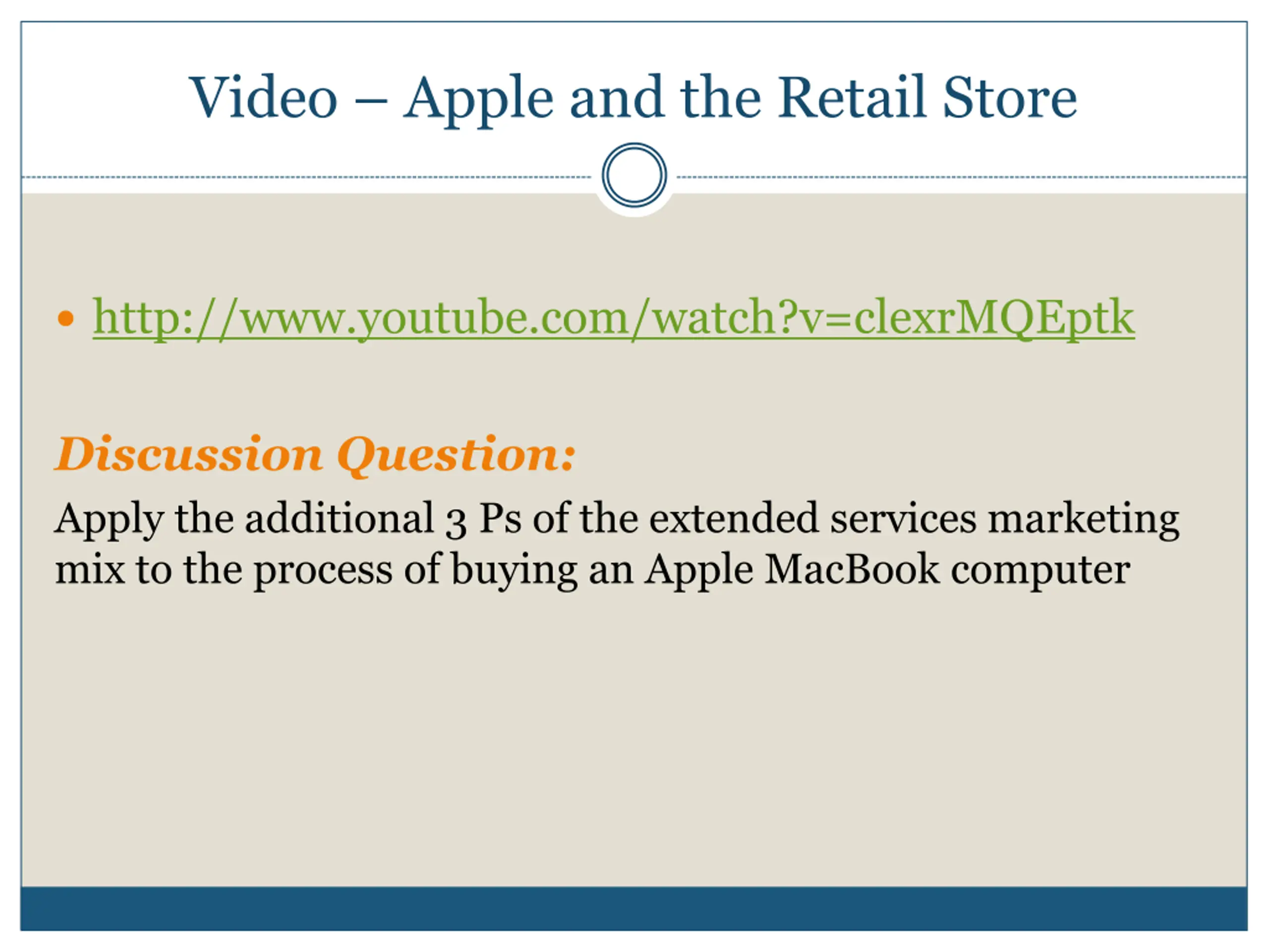 Video Apple and the Retail Store http://www.youtube.com/watch?v=clexrMQEptk Discussion Question: Apply the additional 3 Ps of the extended services marketing mix to the process of buying an Apple MacBook computer