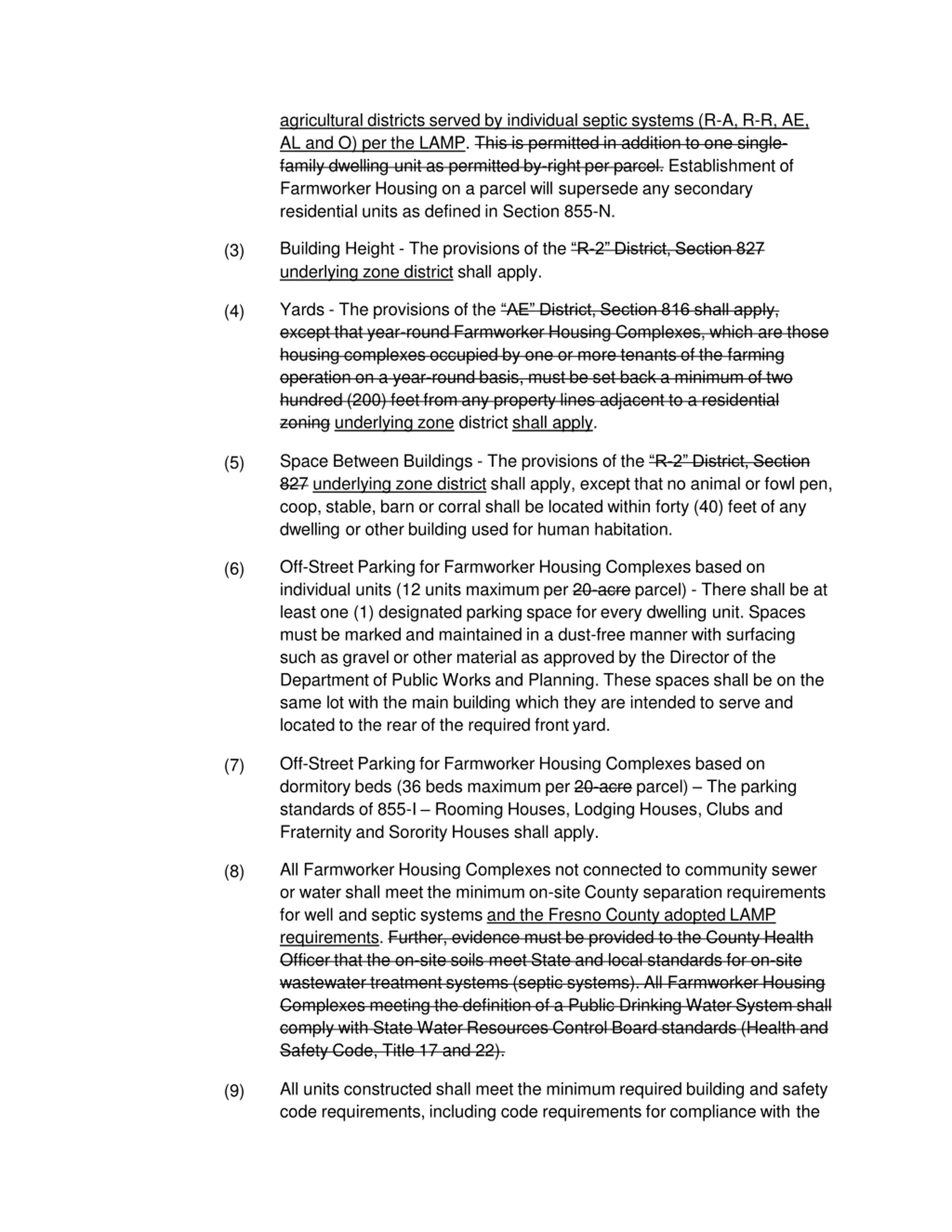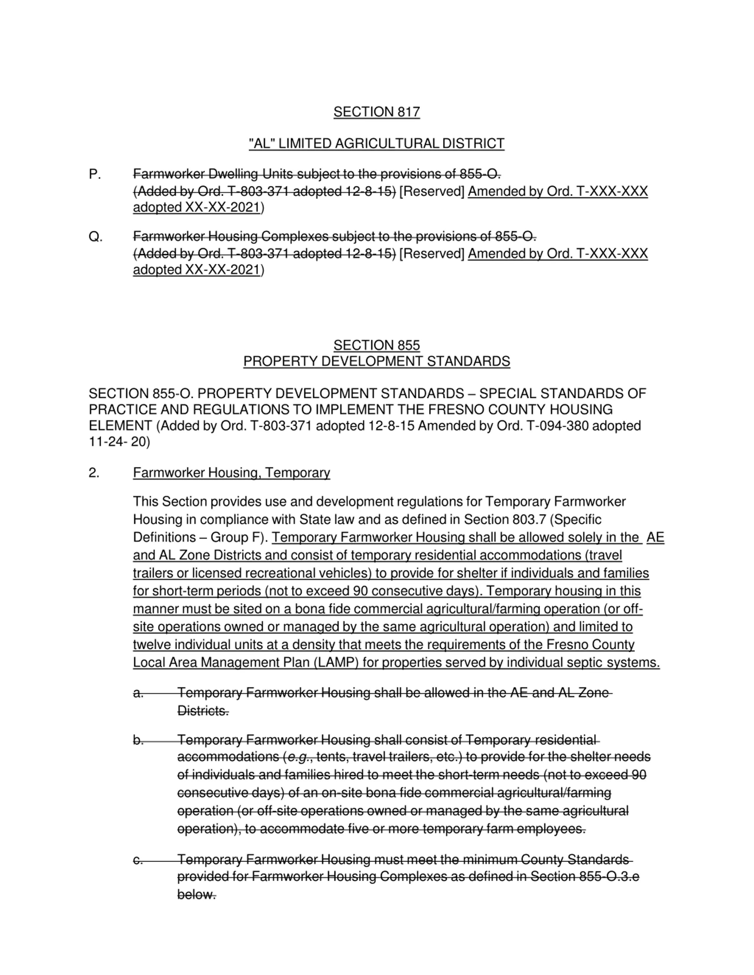 SECTION 817 "AL" LIMITED AGRICULTURALDISTRICT Farmworker Dwelling Units subject to the provisions of 855-O. (Added by Ord. T-803-371 adopted 12-8-15) [Reserved] Amended by Ord. T-XXX-XXX adopted XX-XX-2021) P. Farmworker Housing Complexes subject to the provisions of 855-O. (Added by Ord. T-803-371 adopted 12-8-15) [Reserved] Amended by Ord. T-XXX-XXX adopted XX-XX-2021) Q. SECTION 855 PROPERTY DEVELOPMENT STANDARDS SECTION 855-O. PROPERTY DEVELOPMENT STANDARDS SPECIAL STANDARDS OF PRACTICE AND REGULATIONS TO IMPLEMENT THE FRESNO COUNTY HOUSING ELEMENT (Added by Ord. T-803-371 adopted 12-8-15 Amended by Ord. T-094-380 adopted 11-24- 20) 2. Farmworker Housing, Temporary This Section provides use and development regulations for Temporary Farmworker Housing in compliance with State law and as defined in Section 803.7 (Specific Definitions Group F). Temporary Farmworker Housing shall be allowed solely in the AE and AL Zone Districts and consist of temporary residential accommodations (travel trailers or licensed recreational vehicles) to provide for shelter if individuals and families for short-term periods (not to exceed 90 consecutive days). Temporary housing in this manner must be sited on a bona fide commercial agricultural/farming operation (or off- site operations owned or managed by the same agricultural operation) and limited to twelve individual units at a density that meets the requirements of the Fresno County Local Area Management Plan (LAMP) for properties served by individual septic systems. a. Temporary Farmworker Housing shall be allowed in the AE and AL Zone Districts. b. Temporary Farmworker Housing shall consist of Temporary residential accommodations (e.g., tents, travel trailers, etc.) to provide for the shelter needs of individuals and families hired to meet the short-term needs (not to exceed 90 consecutive days) of an on-site bona fide commercial agricultural/farming operation (or off-site operations owned or managed by the same agricultural operation), to accommodate five or more temporary farm employees. c. Temporary Farmworker Housing must meet the minimum County Standards provided for Farmworker Housing Complexes as defined in Section 855-O.3.e below.