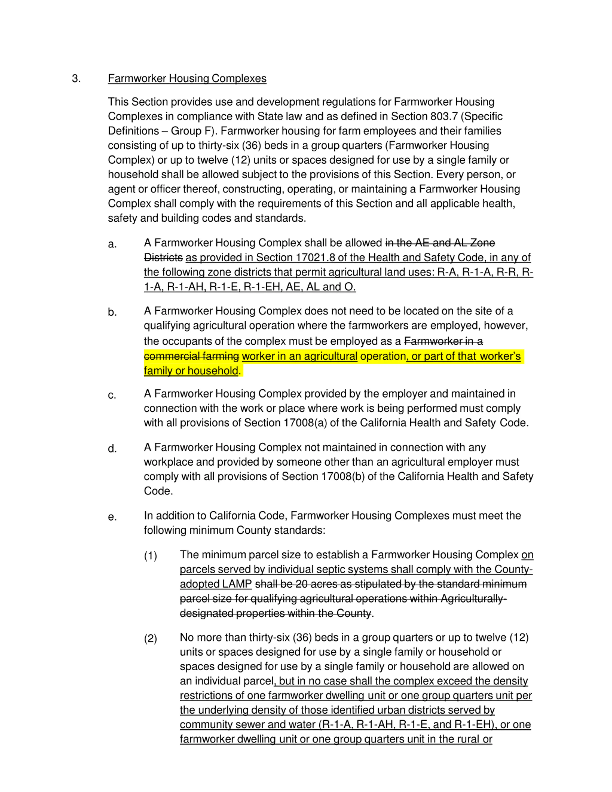 3. Farmworker Housing Complexes This Section provides use and development regulations for Farmworker Housing Complexes in compliance with State law and as defined in Section 803.7 (Specific Definitions Group F). Farmworker housing for farm employees and their families consisting of up to thirty-six (36) beds in a group quarters (Farmworker Housing Complex) or up to twelve (12) units or spaces designed for use by a single family or household shall be allowed subject to the provisions of this Section. Every person, or agent or officer thereof, constructing, operating, or maintaining a Farmworker Housing Complex shall comply with the requirements of this Section and all applicable health, safety and building codes and standards. A Farmworker Housing Complex shall be allowed in the AE and AL Zone Districts as provided in Section 17021.8 of the Health and Safety Code, in any of the following zone districts that permit agricultural land uses: R-A, R-1-A, R-R, R- 1-A, R-1-AH, R-1-E, R-1-EH, AE, AL and O. a. A Farmworker Housing Complex does not need to be located on the site of a qualifying agricultural operation where the farmworkers are employed, however, the occupants of the complex must be employed as a Farmworker in a commercial farming worker in an agricultural operation, or part of that worker s family or household. b. A Farmworker Housing Complex provided by the employer and maintained in connection with the work or place where work is being performed must comply with all provisions of Section 17008(a) of the California Health and Safety Code. c. A Farmworker Housing Complex not maintained in connection with any workplace and provided by someone other than an agricultural employer must comply with all provisions of Section 17008(b) of the California Health and Safety Code. d. In addition to California Code, Farmworker Housing Complexes must meet the following minimum County standards: e. The minimum parcel size to establish a Farmworker Housing Complex on parcels served by individual septic systems shall comply with the County- adopted LAMP shall be 20 acres as stipulated by the standard minimum parcel size for qualifying agricultural operations within Agriculturally- designated properties within the County. (1) No more than thirty-six (36) beds in a group quarters or up to twelve (12) units or spaces designed for use by a single family or household or spaces designed for use by a single family or household are allowed on an individual parcel, but in no case shall the complex exceed the density restrictions of one farmworker dwelling unit or one group quarters unit per the underlying density of those identified urban districts served by community sewer and water (R-1-A, R-1-AH, R-1-E, and R-1-EH), or one farmworker dwelling unit or one group quarters unit in the rural or (2)