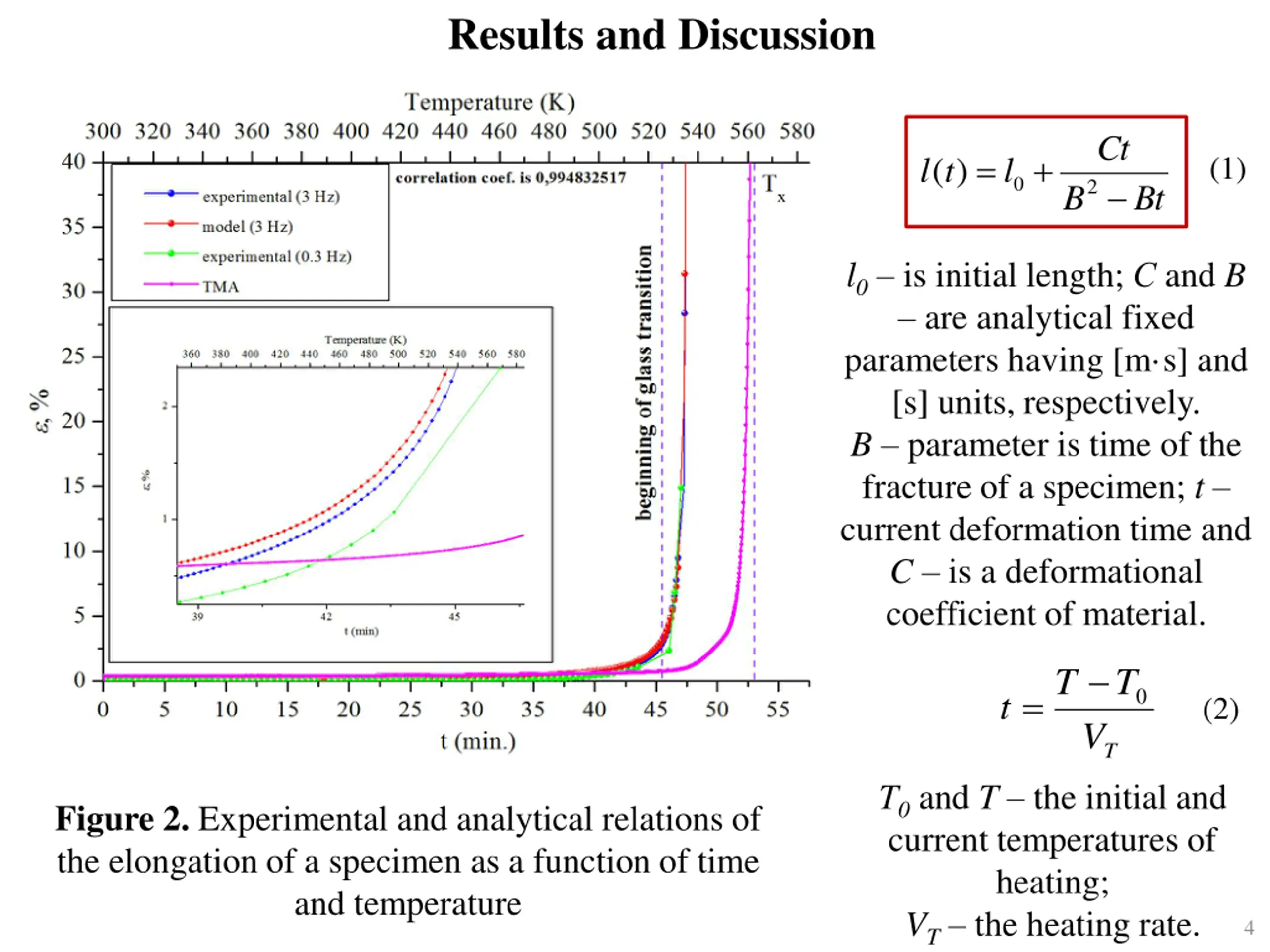 Results and Discussion Ct = + (1) ( ) l t l 0 2 B Bt l0 is initial length; and B are analytical fixed parameters having [m s] and [s] units, respectively. B parameter is time of the fracture of a specimen; t current deformation time and C is a deformational coefficient of material. T T = 0 t (2) V T T0 and T the initial and current temperatures of heating; VT the heating rate. Figure 2. Experimental and analytical relations of the elongation of a specimen as a function of time and temperature 4