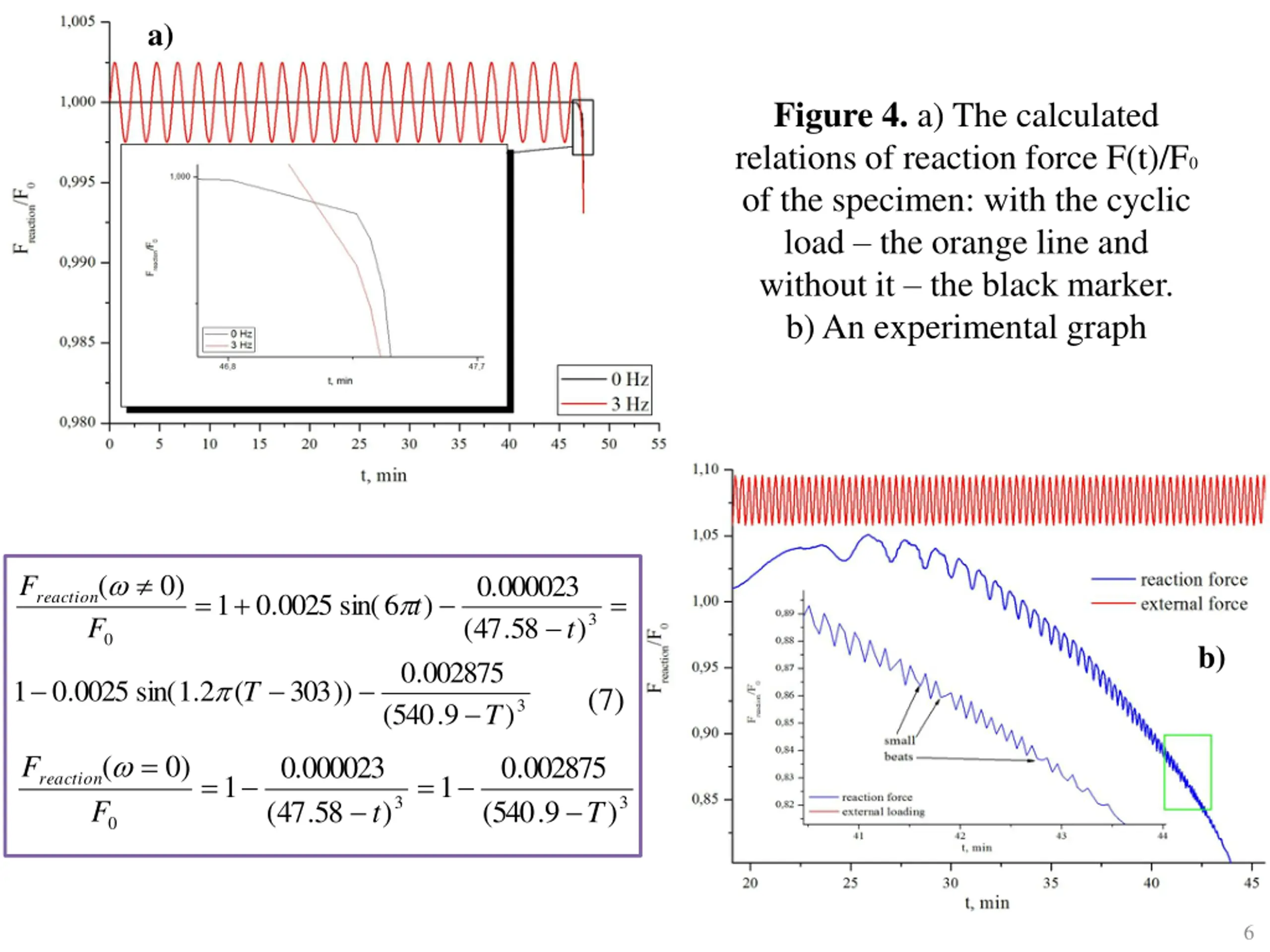 a) Figure 4. a) The calculated relations of reaction force F(t)/F0 of the specimen: with the cyclic load the orange line and without it the black marker. b) An experimental graph , ( ) 0 Freaction 0.000023 = + = 1 . 0 0025 sin( 6 ) t 3 F ( 47 58 . ) t 0 b) 002875 . 0 1 . 0 0025 sin( 2 . 1 ( 303 )) T (7) 3 540 ( 9 . ) T = ( ) 0 Freaction 0.000023 002875 . 0 = = 1 1 3 3 F ( 47 58 . ) 540 ( 9 . ) t T 0 6
