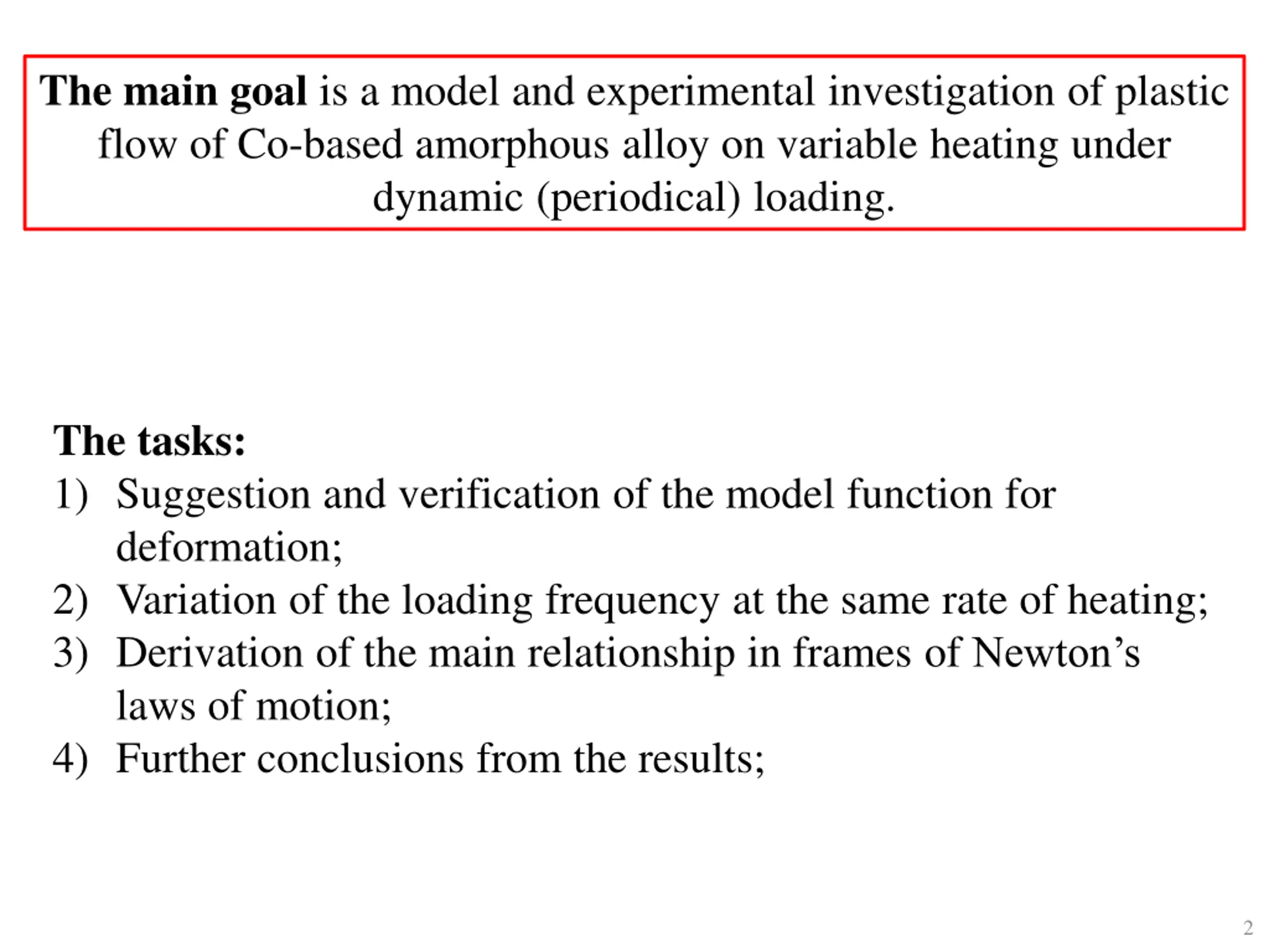 The main goal is a model and experimental investigation of plastic flow of Co-based amorphous alloy on variable heating under dynamic (periodical) loading. The tasks: 1) Suggestion and verification of the model function for deformation; 2) Variation of the loading frequency at the same rate of heating; 3) Derivation of the main relationship in frames of Newton s laws of motion; 4) Further conclusions from the results; 2