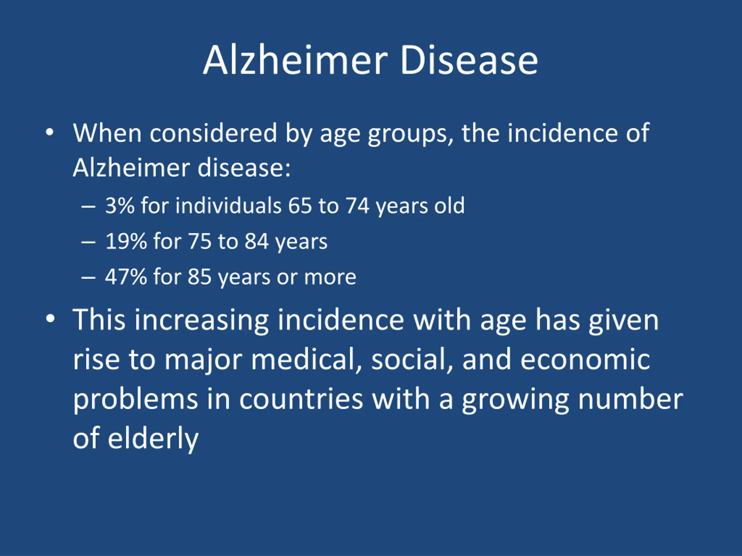 Alzheimer Disease When considered by age groups, the incidence of Alzheimer disease: 3% for individuals 65 to 74 years old 19% for 75 to 84 years 47% for 85 years or more This increasing incidence with age has given rise to major medical, social, and economic problems in countries with a growing number of elderly