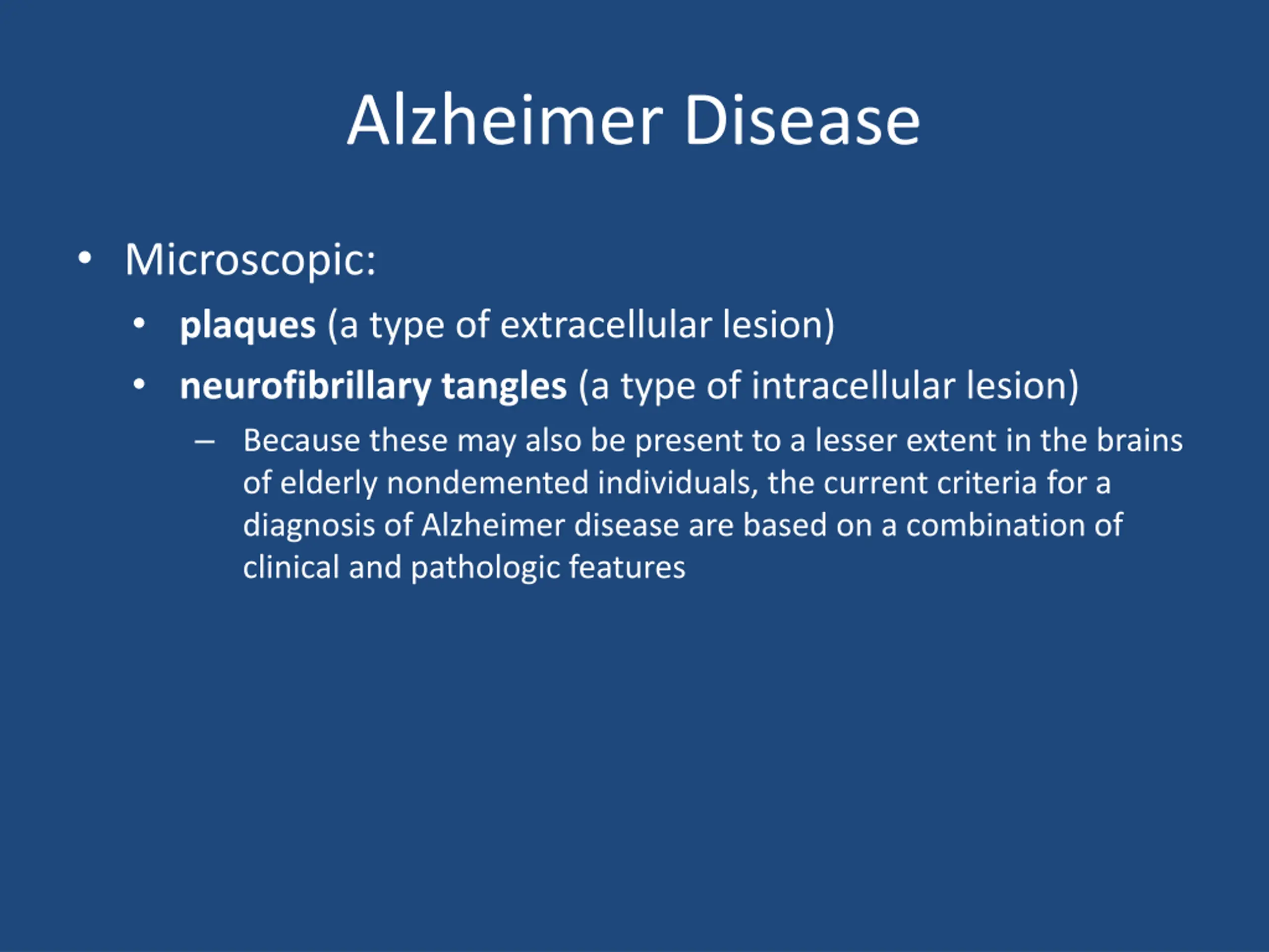 Alzheimer Disease Microscopic: plaques (a type of extracellular lesion) neurofibrillary tangles (a type of intracellular lesion) Because these may also be present to a lesser extent in the brains of elderly nondemented individuals, the current criteria for a diagnosis of Alzheimer disease are based on a combination of clinical and pathologic features