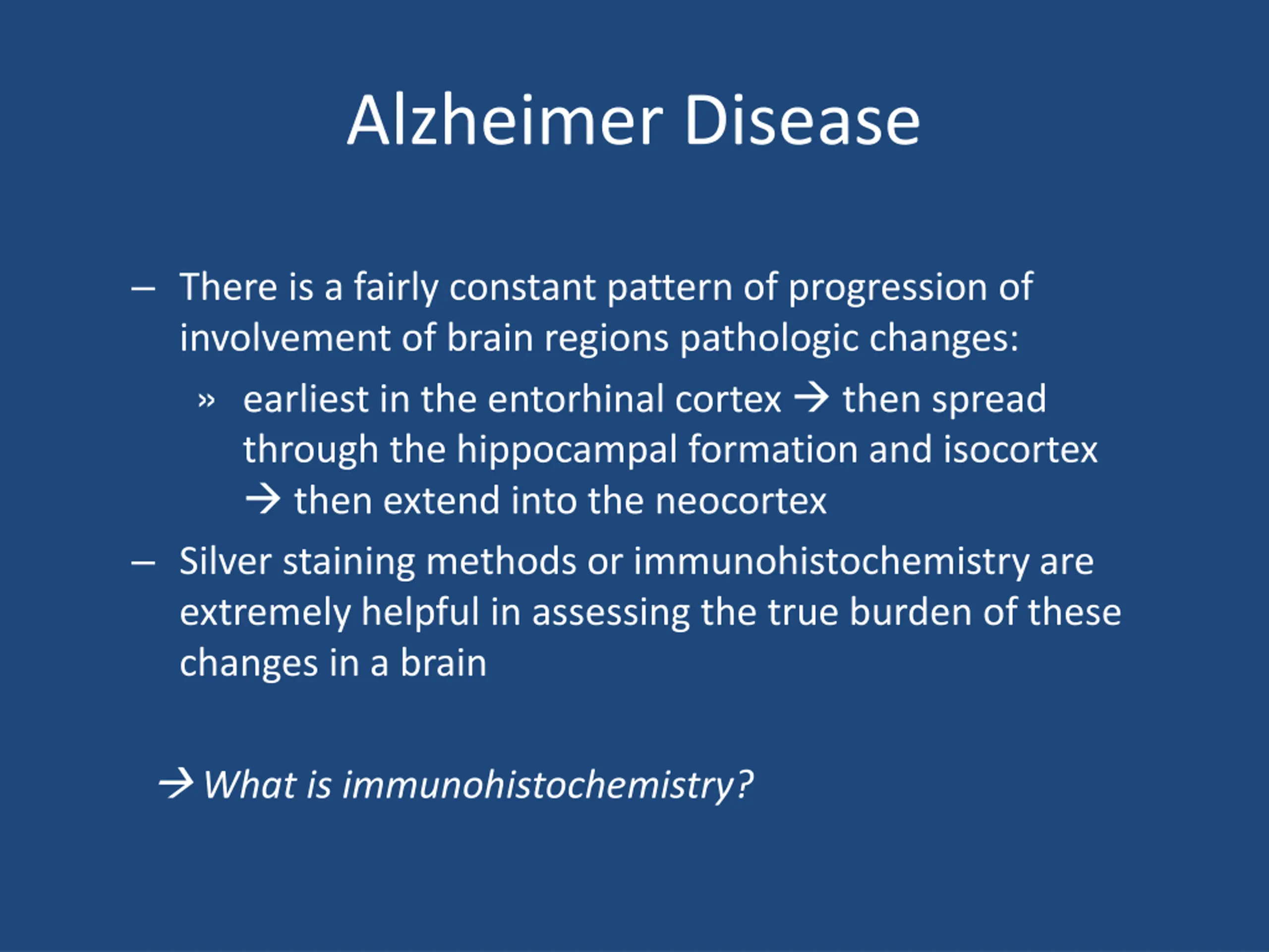 Alzheimer Disease There is a fairly constant pattern of progression of involvement of brain regions pathologic changes: earliest in the entorhinal cortex then spread through the hippocampal formation and isocortex then extend into the neocortex Silver staining methods or immunohistochemistry are extremely helpful in assessing the true burden of these changes in a brain What is immunohistochemistry?