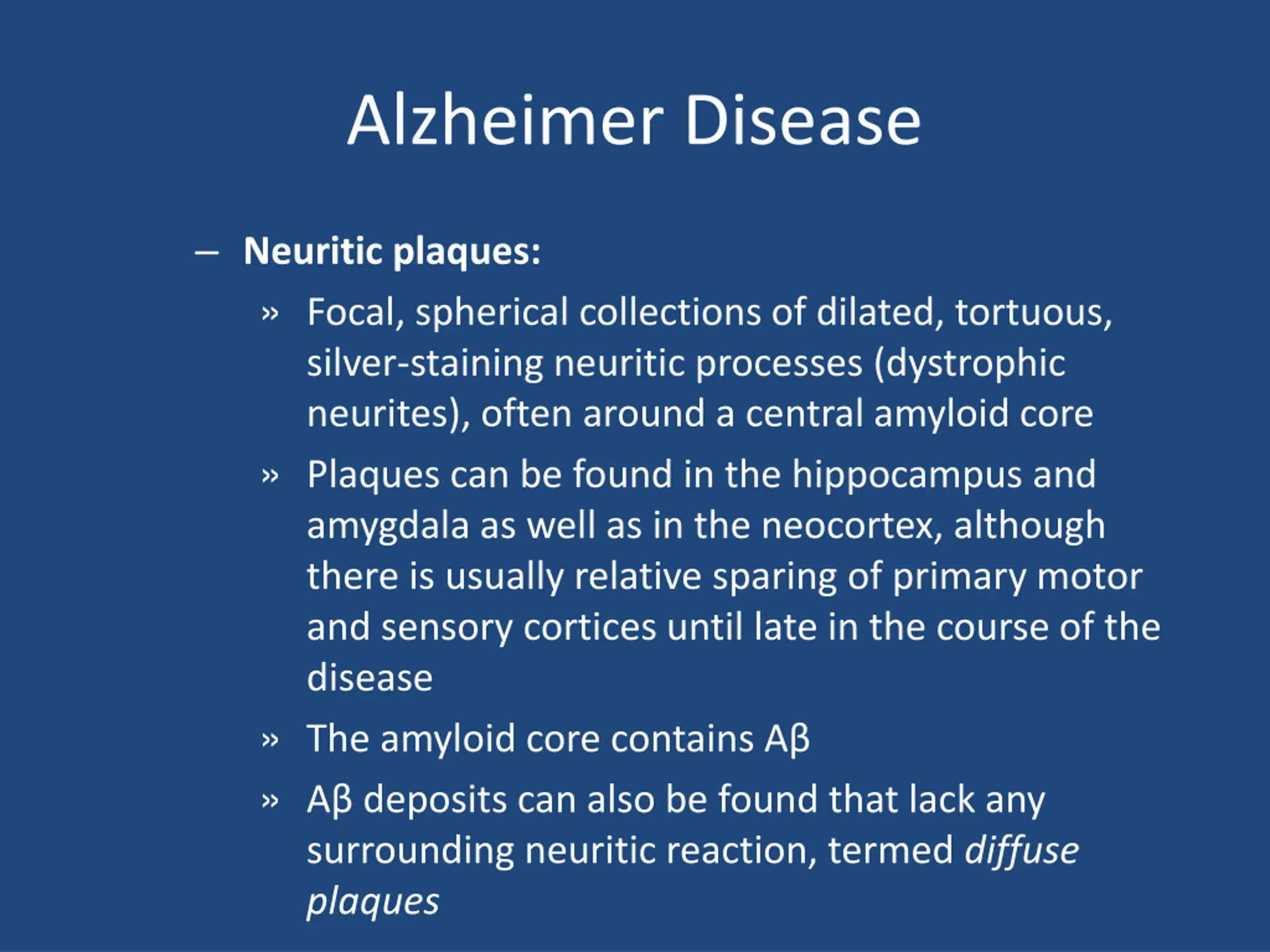 Alzheimer Disease Neuritic plaques: Focal, spherical collections of dilated, tortuous, silver-staining neuritic processes (dystrophic neurites), often around a central amyloid core Plaques can be found in the hippocampus and amygdala as well as in the neocortex, although there is usually relative sparing of primary motor and sensory cortices until late in the course of the disease The amyloid core contains A A deposits can also be found that lack any surrounding neuritic reaction, termed diffuse plaques