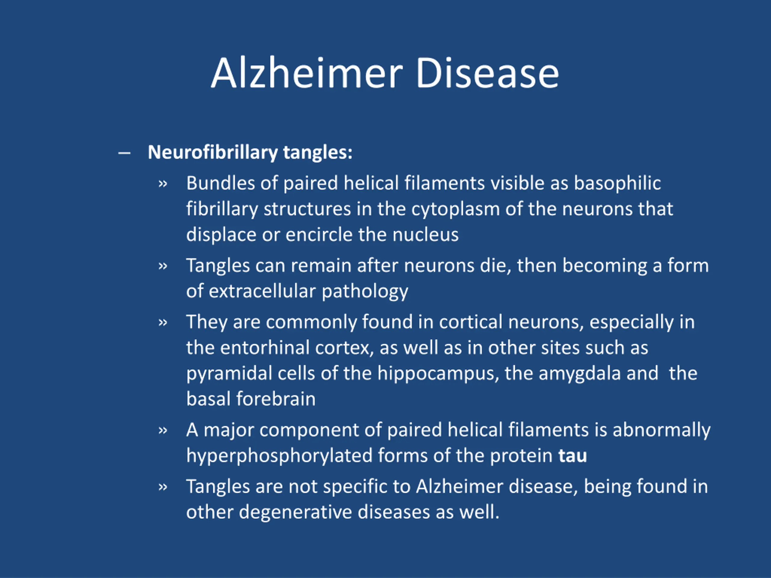 Alzheimer Disease Neurofibrillary tangles: Bundles of paired helical filaments visible as basophilic fibrillary structures in the cytoplasm of the neurons that displace or encircle the nucleus Tangles can remain after neurons die, then becoming a form of extracellular pathology They are commonly found in cortical neurons, especially in the entorhinal cortex, as well as in other sites such as pyramidal cells of the hippocampus, the amygdala and the basal forebrain A major component of paired helical filaments is abnormally hyperphosphorylated forms of the protein tau Tangles are not specific to Alzheimer disease, being found in other degenerative diseases as well.