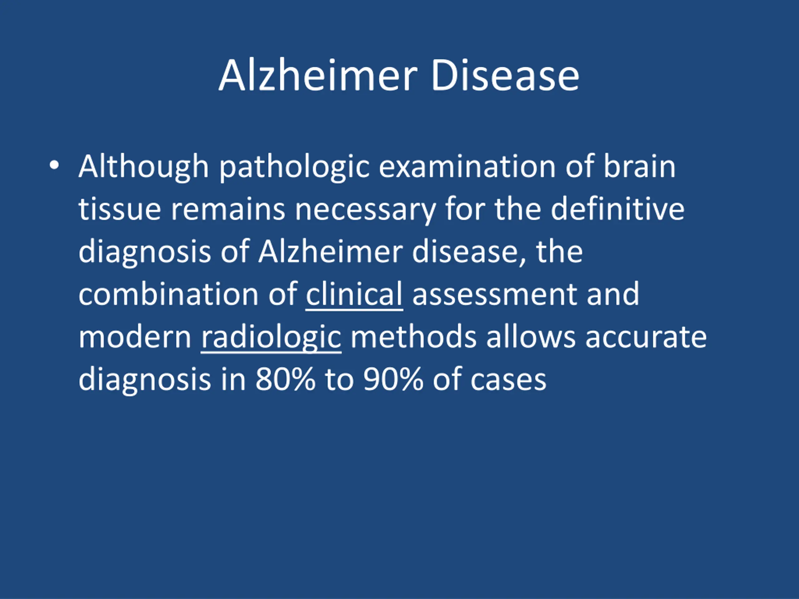Alzheimer Disease Although pathologic examination of brain tissue remains necessary for the definitive diagnosis of Alzheimer disease, the combination of clinical assessment and modern radiologic methods allows accurate diagnosis in 80% to 90% of cases