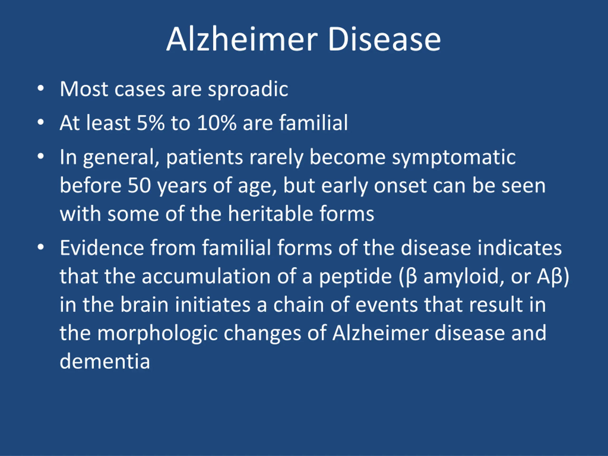 Alzheimer Disease Most cases are sproadic At least 5% to 10% are familial In general, patients rarely become symptomatic before 50 years of age, but early onset can be seen with some of the heritable forms Evidence from familial forms of the disease indicates that the accumulation of a peptide ( amyloid, or A ) in the brain initiates a chain of events that result in the morphologic changes of Alzheimer disease and dementia