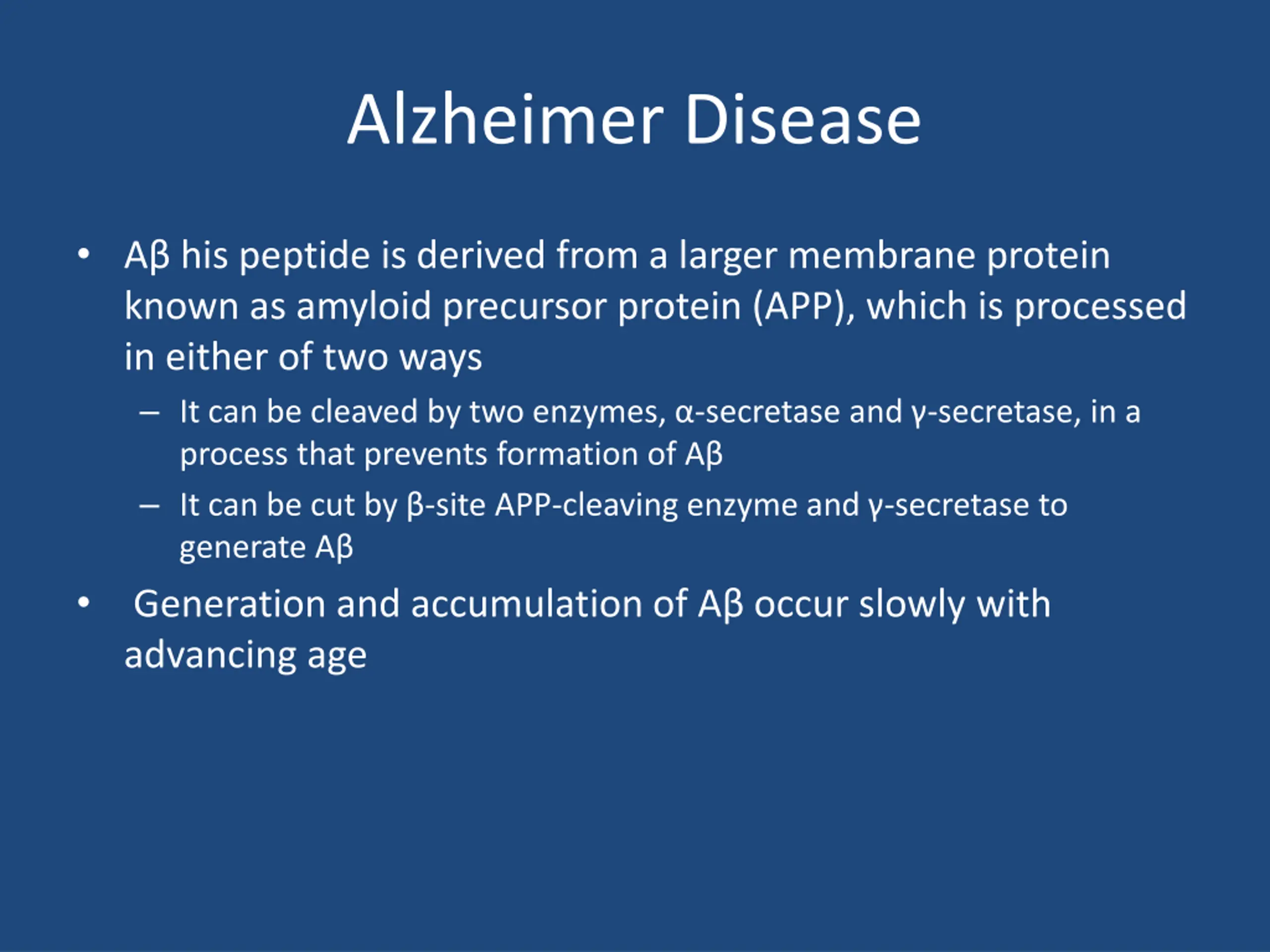 Alzheimer Disease A his peptide is derived from a larger membrane protein known as amyloid precursor protein (APP), which is processed in either of two ways It can be cleaved by two enzymes, -secretase and -secretase, in a process that prevents formation of A It can be cut by -site APP-cleaving enzyme and -secretase to generate A Generation and accumulation of A occur slowly with advancing age