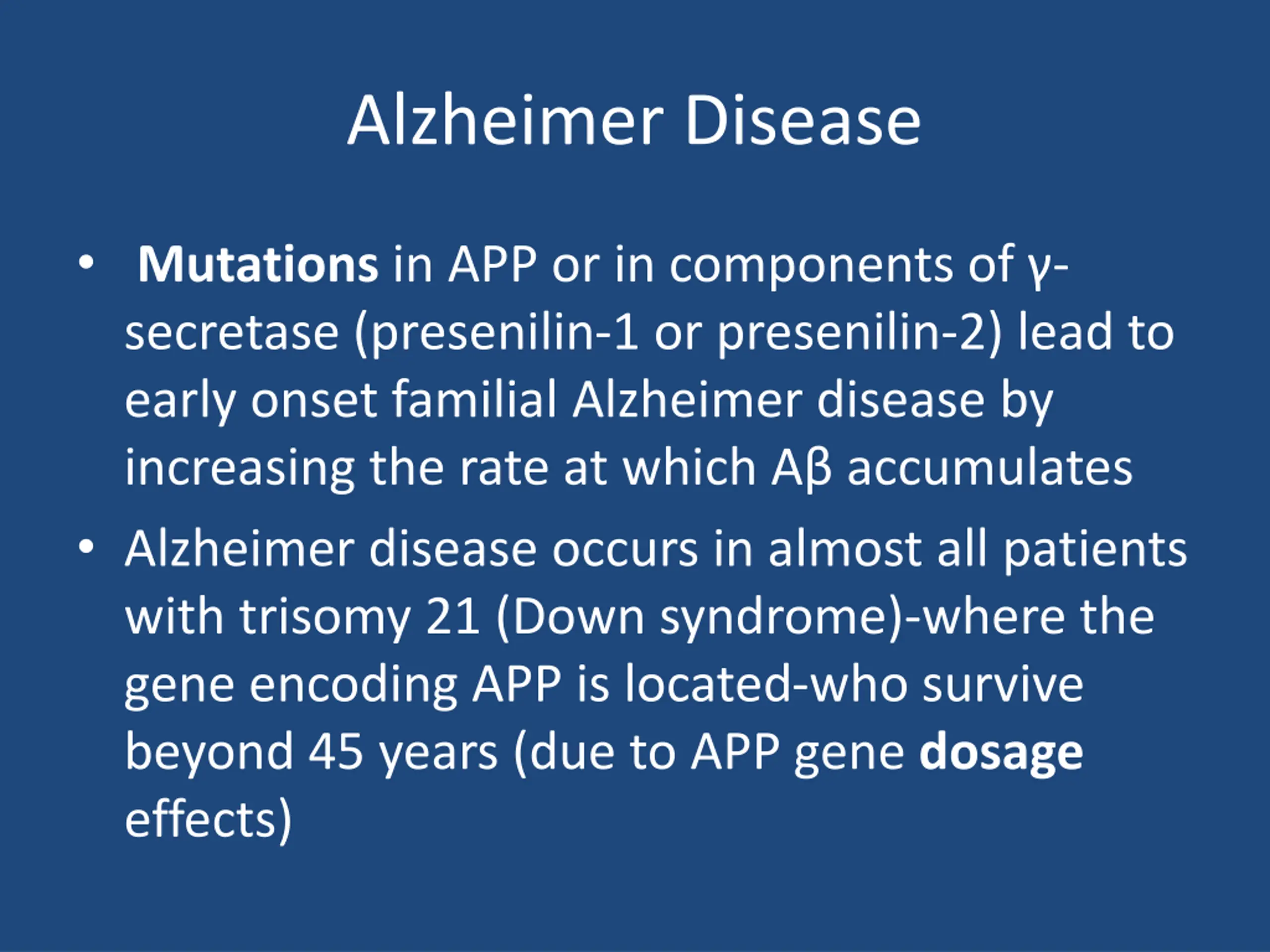 Alzheimer Disease Mutations in APP or in components of - secretase (presenilin-1 or presenilin-2) lead to early onset familial Alzheimer disease by increasing the rate at which A accumulates Alzheimer disease occurs in almost all patients with trisomy 21 (Down syndrome)-where the gene encoding APP is located-who survive beyond 45 years (due to APP gene dosage effects)