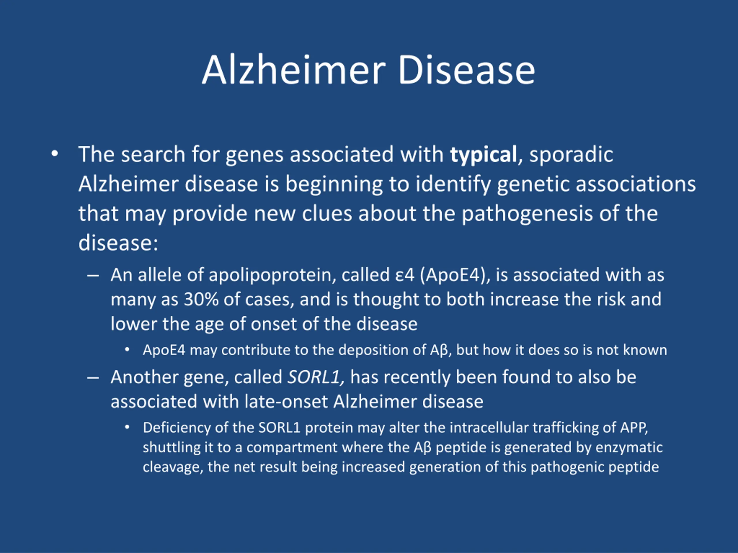 Alzheimer Disease The search for genes associated with typical, sporadic Alzheimer disease is beginning to identify genetic associations that may provide new clues about the pathogenesis of the disease: An allele of apolipoprotein, called 4 (ApoE4), is associated with as many as 30% of cases, and is thought to both increase the risk and lower the age of onset of the disease ApoE4 may contribute to the deposition of A , but how it does so is not known Another gene, called SORL1, has recently been found to also be associated with late-onset Alzheimer disease Deficiency of the SORL1 protein may alter the intracellular trafficking of APP, shuttling it to a compartment where the A peptide is generated by enzymatic cleavage, the net result being increased generation of this pathogenic peptide
