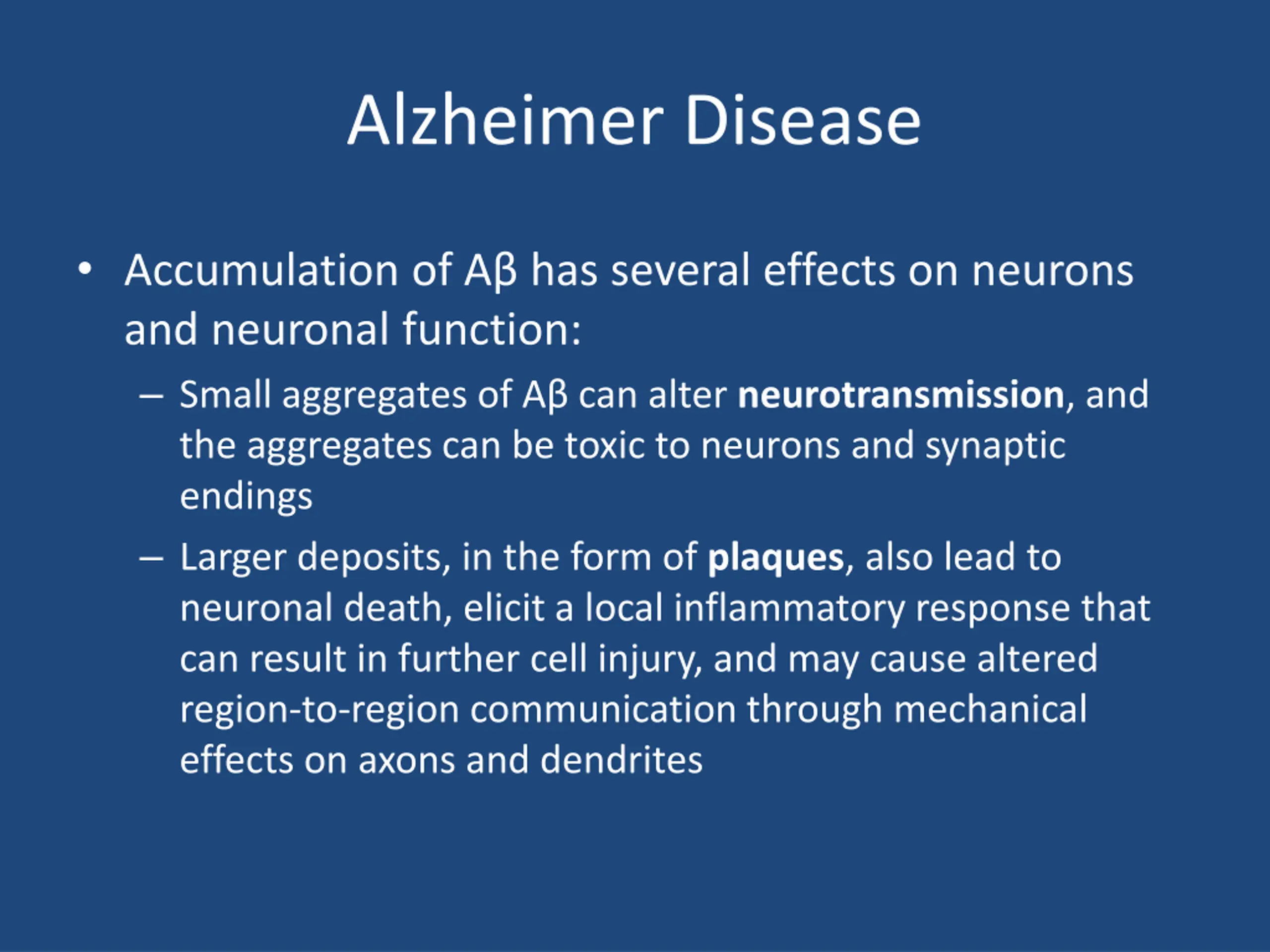 Alzheimer Disease Accumulation of A has several effects on neurons and neuronal function: Small aggregates of A can alter neurotransmission, and the aggregates can be toxic to neurons and synaptic endings Larger deposits, in the form of plaques, also lead to neuronal death, elicit a local inflammatory response that can result in further cell injury, and may cause altered region-to-region communication through mechanical effects on axons and dendrites