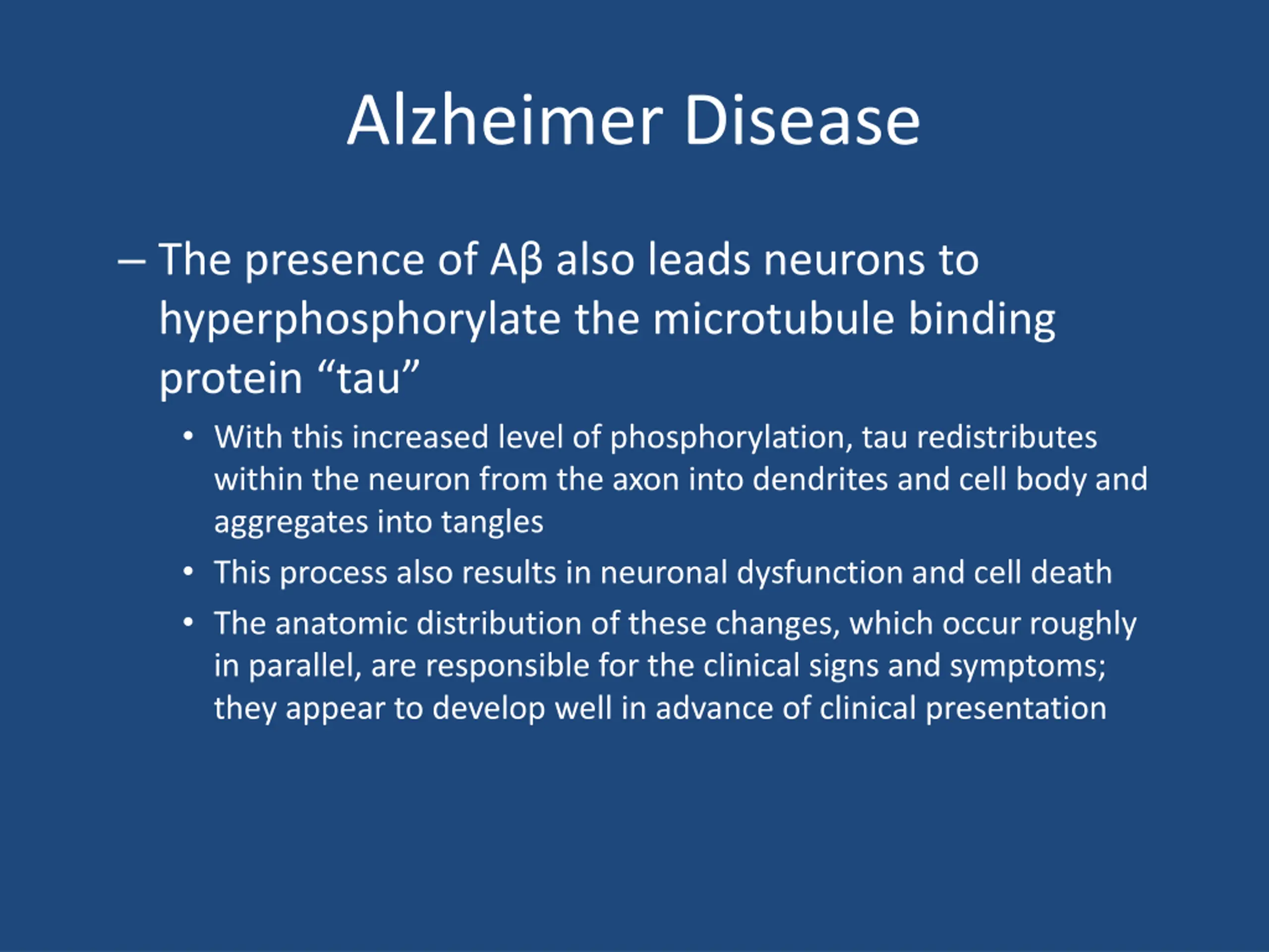 Alzheimer Disease The presence of A also leads neurons to hyperphosphorylate the microtubule binding protein tau With this increased level of phosphorylation, tau redistributes within the neuron from the axon into dendrites and cell body and aggregates into tangles This process also results in neuronal dysfunction and cell death The anatomic distribution of these changes, which occur roughly in parallel, are responsible for the clinical signs and symptoms; they appear to develop well in advance of clinical presentation