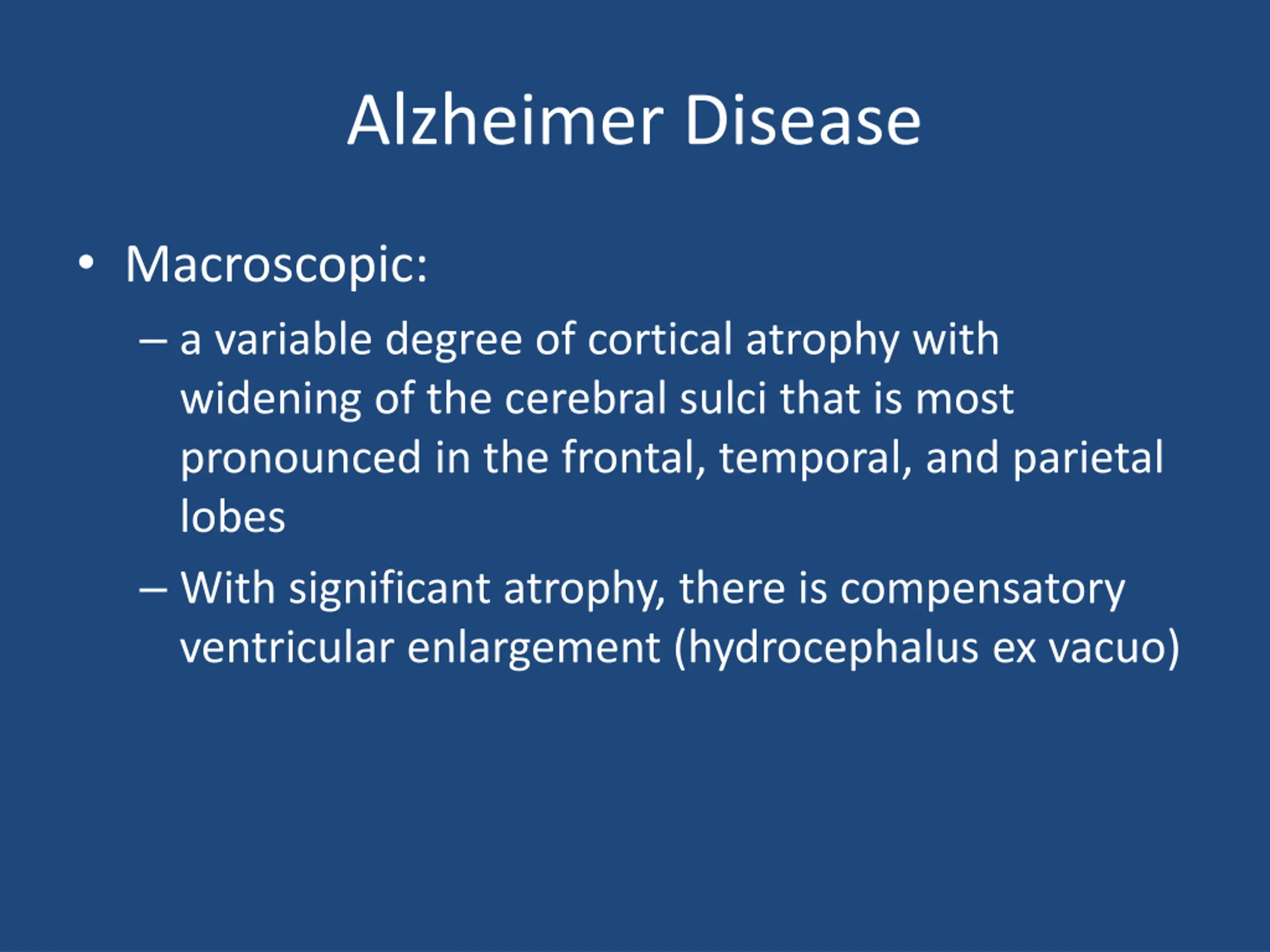 Alzheimer Disease Macroscopic: a variable degree of cortical atrophy with widening of the cerebral sulci that is most pronounced in the frontal, temporal, and parietal lobes With significant atrophy, there is compensatory ventricular enlargement (hydrocephalus ex vacuo)