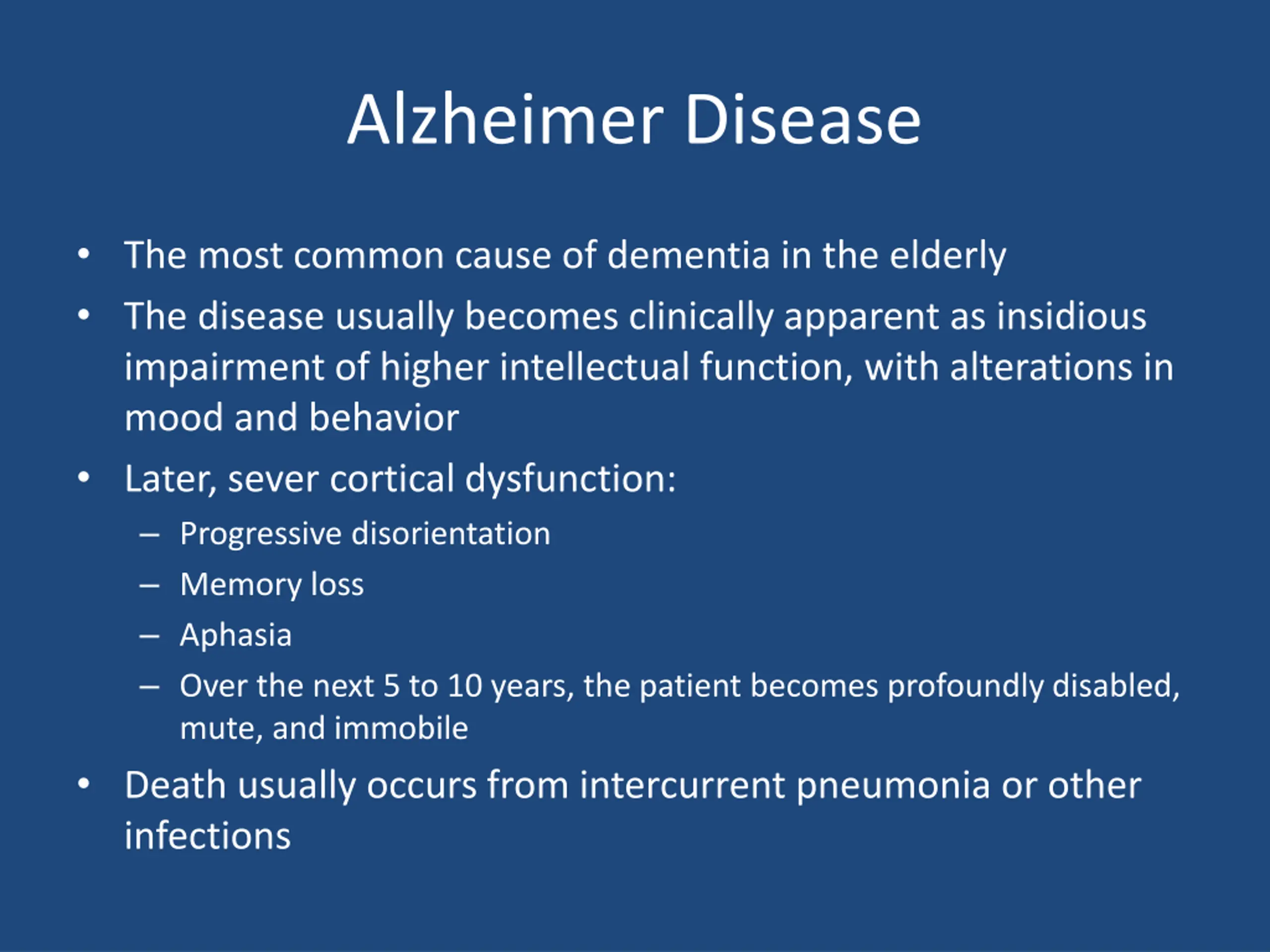 Alzheimer Disease The most common cause of dementia in the elderly The disease usually becomes clinically apparent as insidious impairment of higher intellectual function, with alterations in mood and behavior Later, sever cortical dysfunction: Progressive disorientation Memory loss Aphasia Over the next 5 to 10 years, the patient becomes profoundly disabled, mute, and immobile Death usually occurs from intercurrent pneumonia or other infections