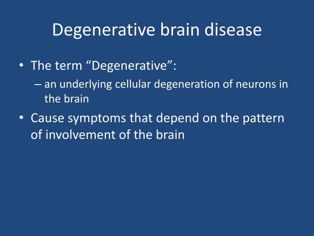 Degenerative brain disease The term Degenerative : an underlying cellular degeneration of neurons in the brain Cause symptoms that depend on the pattern of involvement of the brain