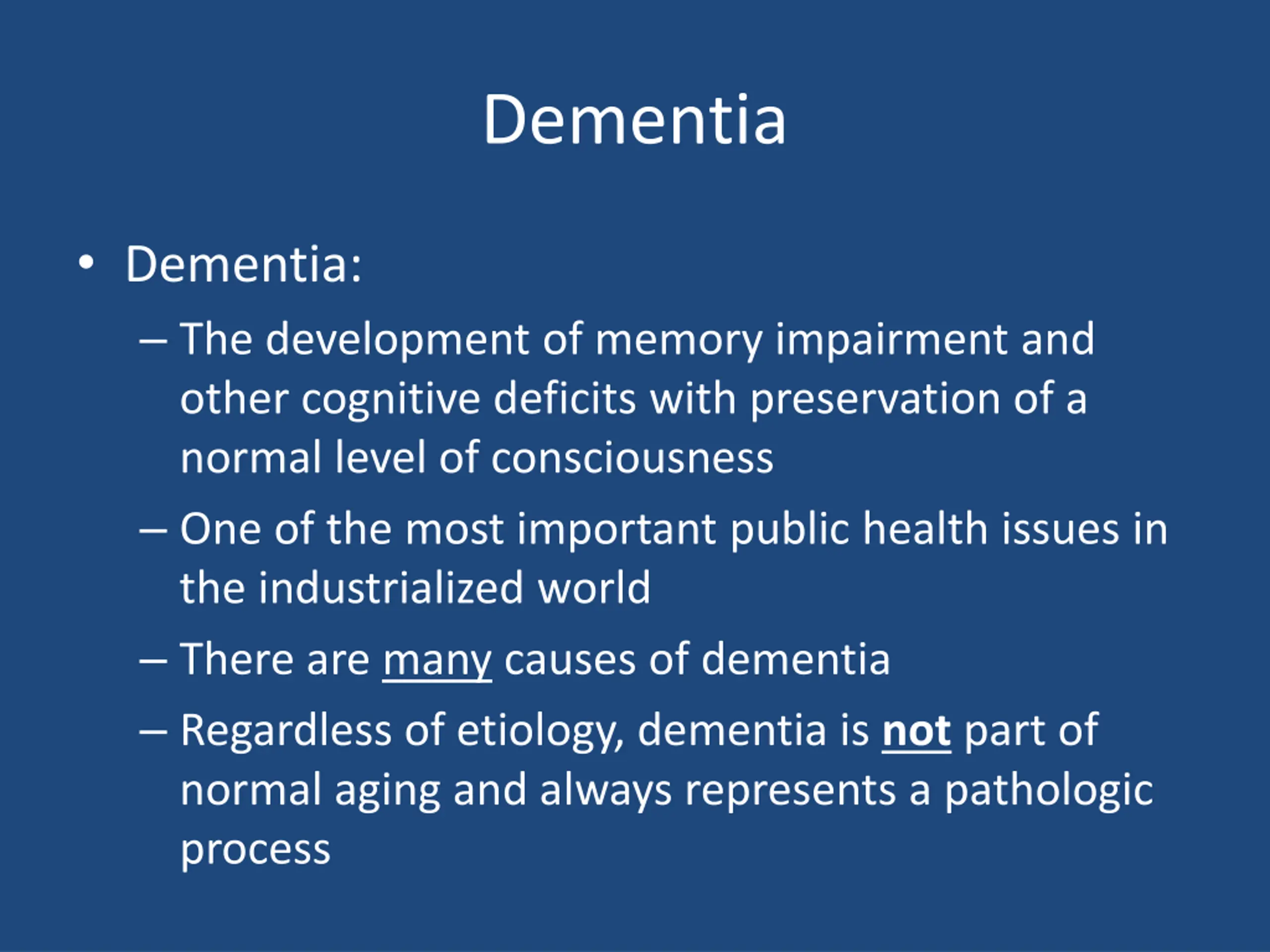 Dementia Dementia: The development of memory impairment and other cognitive deficits with preservation of a normal level of consciousness One of the most important public health issues in the industrialized world There are many causes of dementia Regardless of etiology, dementia is not part of normal aging and always represents a pathologic process