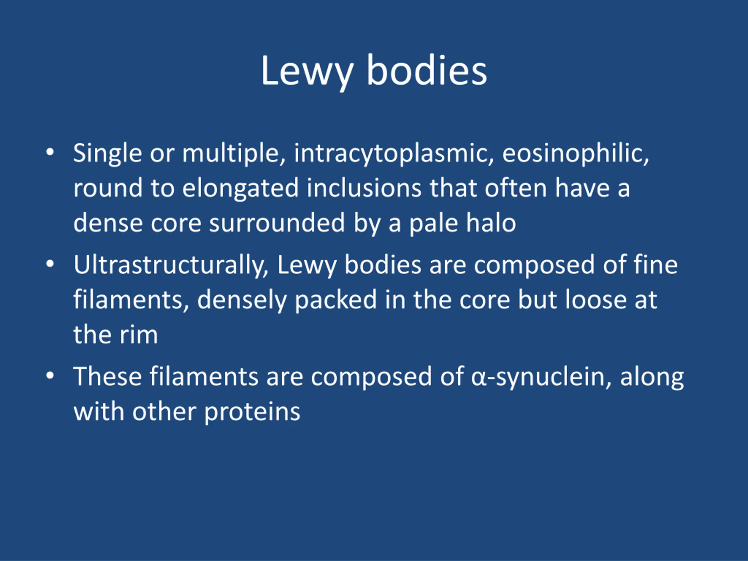 Lewy bodies Single or multiple, intracytoplasmic, eosinophilic, round to elongated inclusions that often have a dense core surrounded by a pale halo Ultrastructurally, Lewy bodies are composed of fine filaments, densely packed in the core but loose at the rim These filaments are composed of -synuclein, along with other proteins