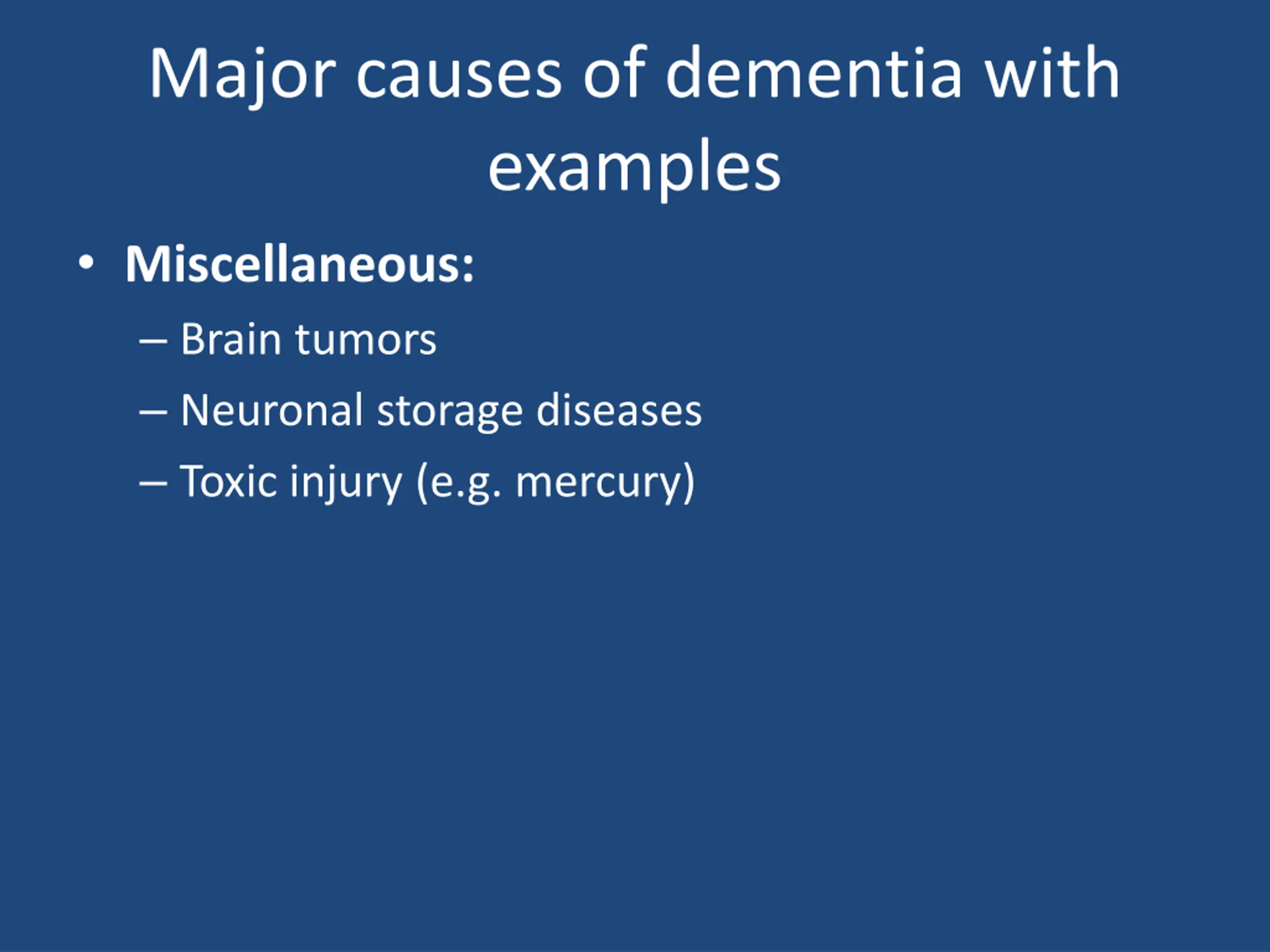 Major causes of dementia with examples Miscellaneous: Brain tumors Neuronal storage diseases Toxic injury (e.g. mercury)