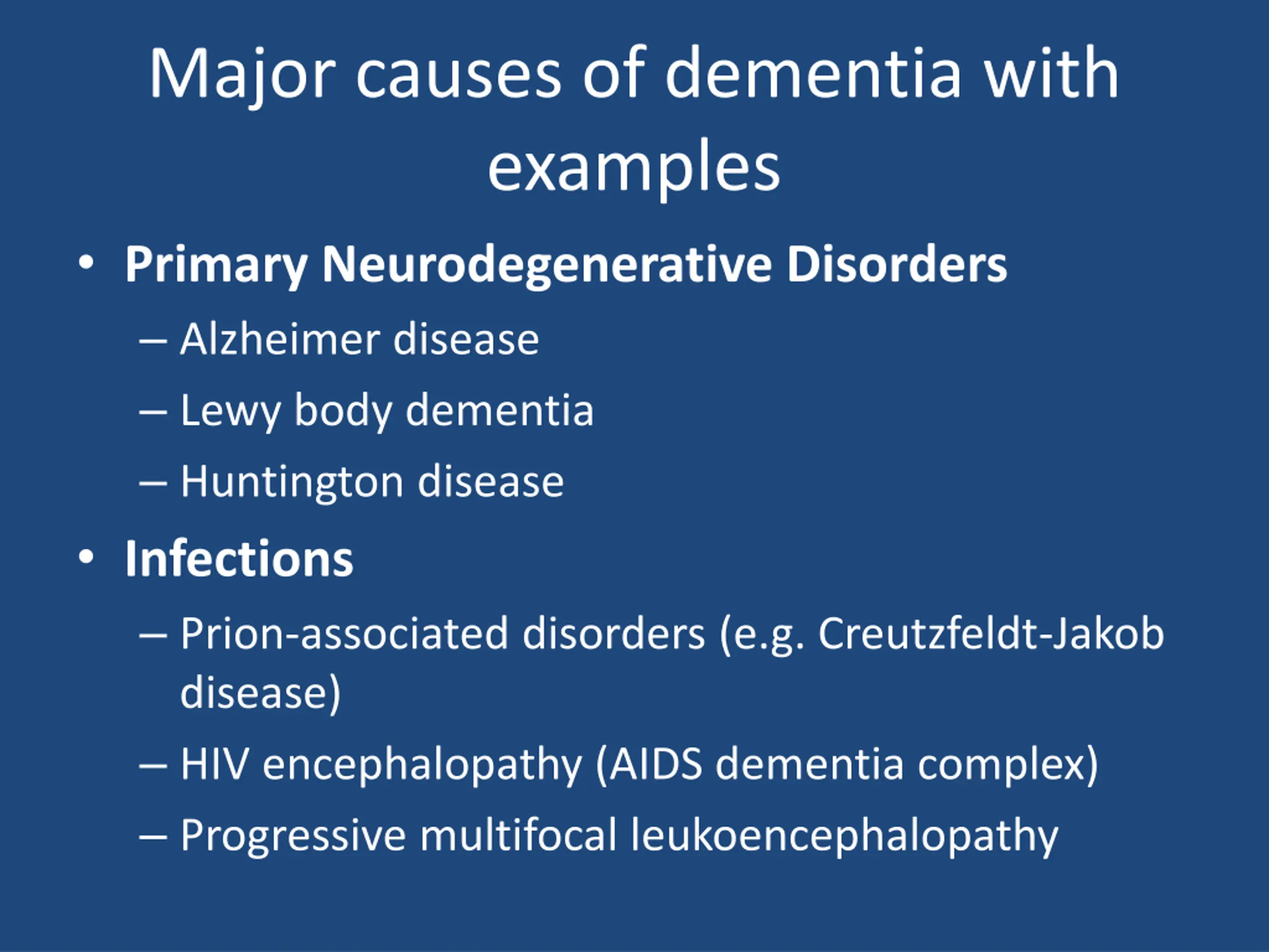 Major causes of dementia with examples Primary Neurodegenerative Disorders Alzheimer disease Lewy body dementia Huntington disease Infections Prion-associated disorders (e.g. Creutzfeldt-Jakob disease) HIV encephalopathy (AIDS dementia complex) Progressive multifocal leukoencephalopathy