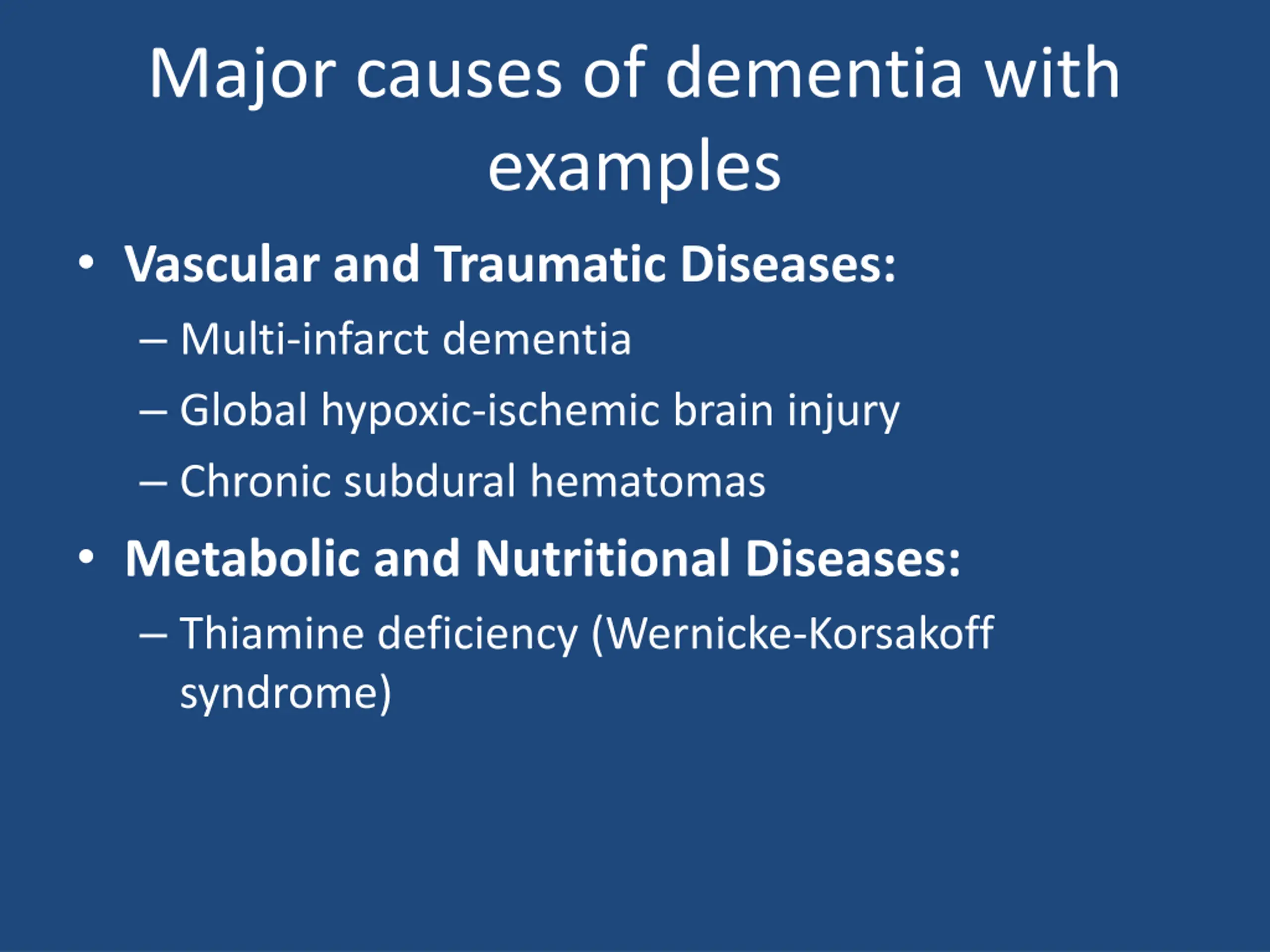 Major causes of dementia with examples Vascular and Traumatic Diseases: Multi-infarct dementia Global hypoxic-ischemic brain injury Chronic subdural hematomas Metabolic and Nutritional Diseases: Thiamine deficiency (Wernicke-Korsakoff syndrome)