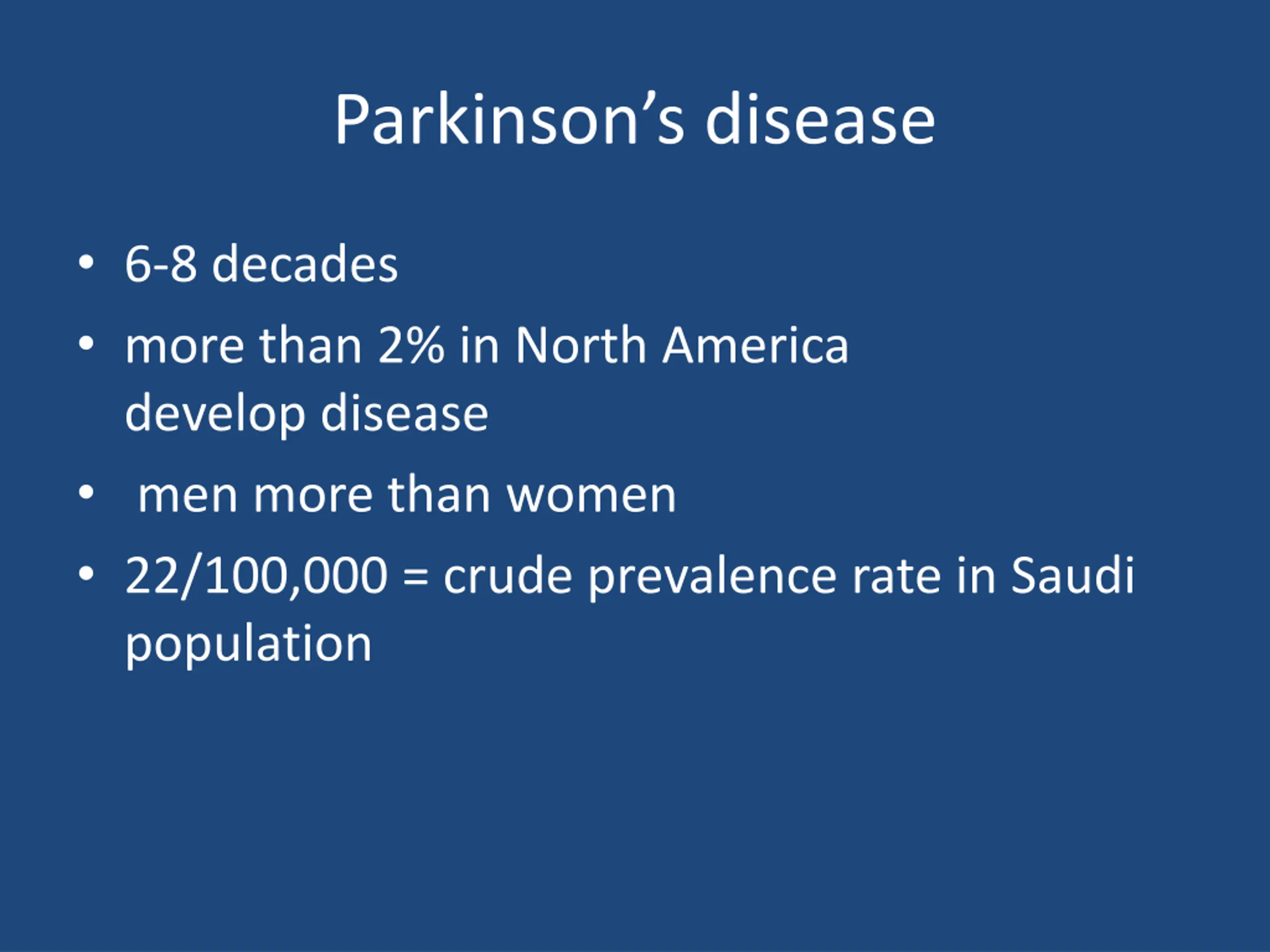 Parkinsons disease 6-8 decades more than 2% in North America develop disease men more than women 22/100,000 = crude prevalence rate in Saudi population