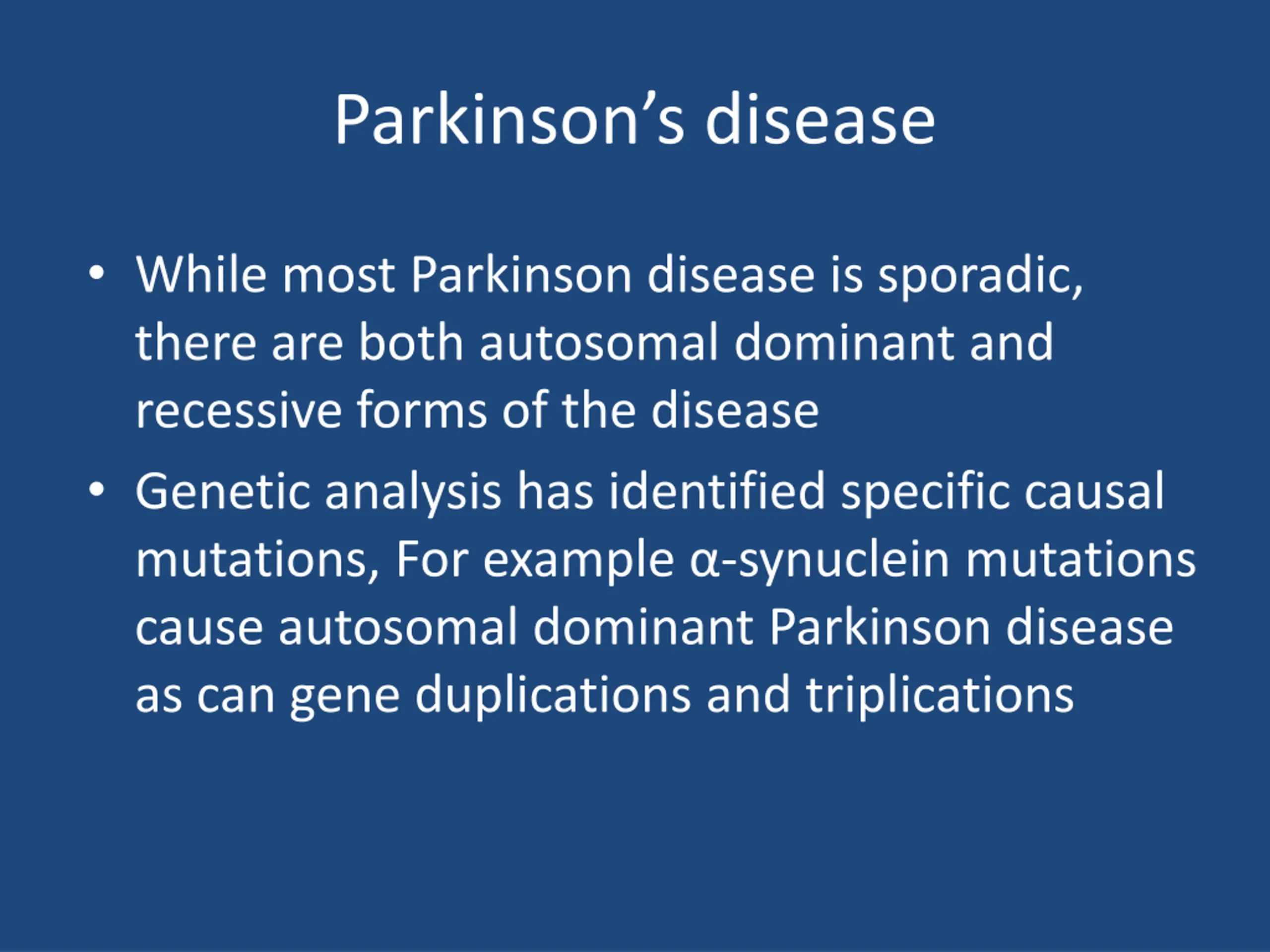 Parkinsons disease While most Parkinson disease is sporadic, there are both autosomal dominant and recessive forms of the disease Genetic analysis has identified specific causal mutations, For example -synuclein mutations cause autosomal dominant Parkinson disease as can gene duplications and triplications