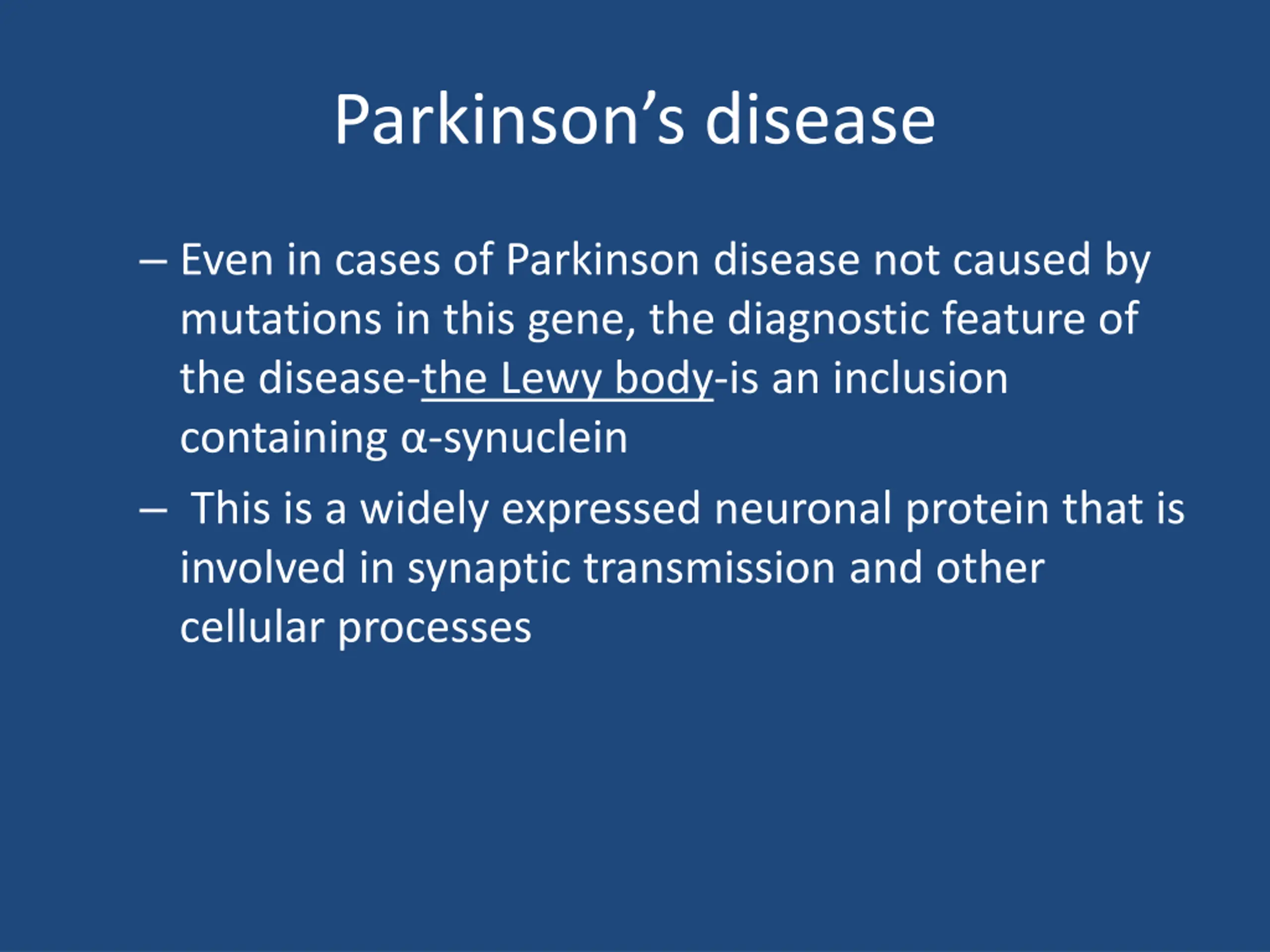 Parkinsons disease Even in cases of Parkinson disease not caused by mutations in this gene, the diagnostic feature of the disease-the Lewy body-is an inclusion containing -synuclein This is a widely expressed neuronal protein that is involved in synaptic transmission and other cellular processes