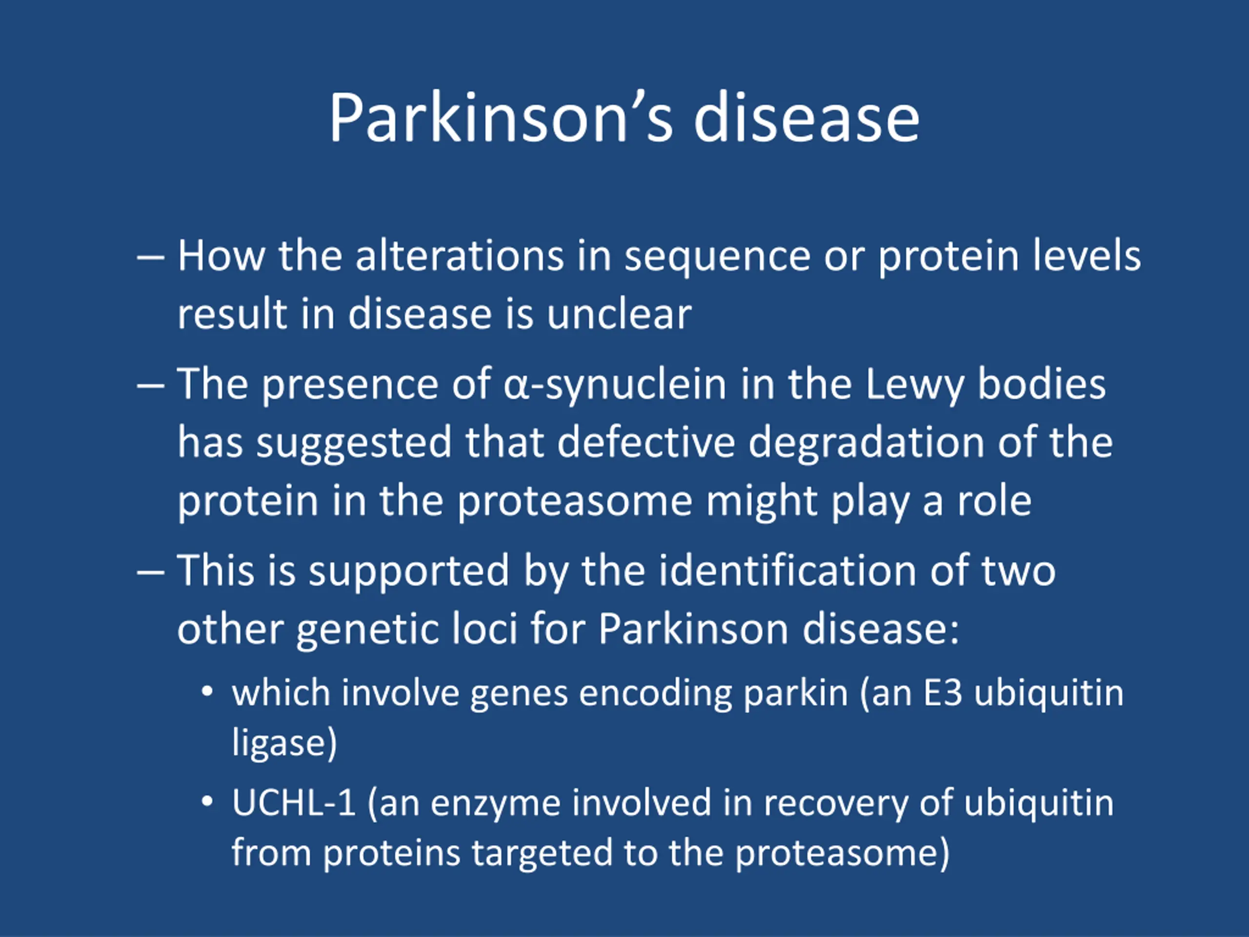 Parkinsons disease How the alterations in sequence or protein levels result in disease is unclear The presence of -synuclein in the Lewy bodies has suggested that defective degradation of the protein in the proteasome might play a role This is supported by the identification of two other genetic loci for Parkinson disease: which involve genes encoding parkin (an E3 ubiquitin ligase) UCHL-1 (an enzyme involved in recovery of ubiquitin from proteins targeted to the proteasome)