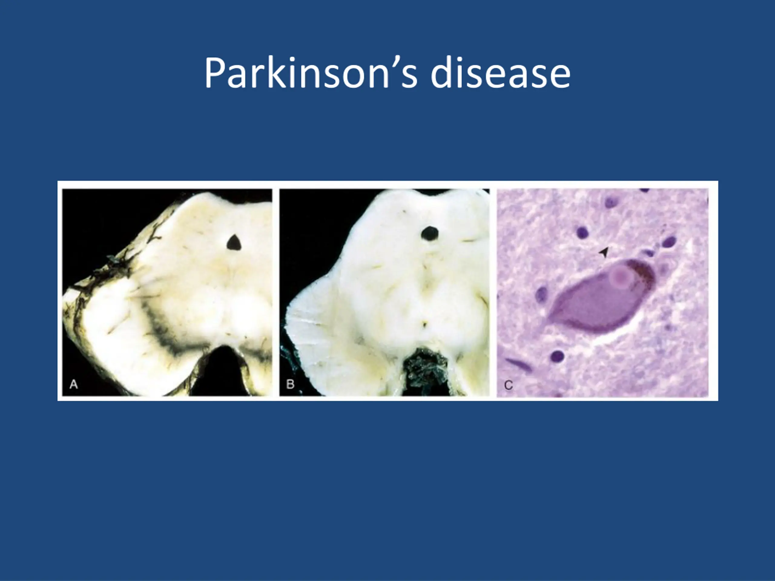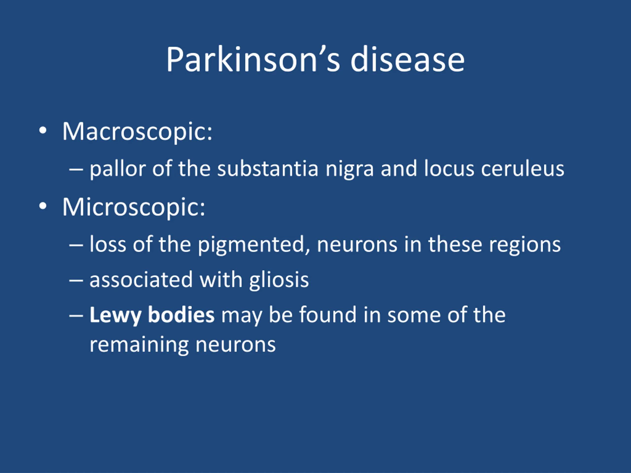Parkinsons disease Macroscopic: pallor of the substantia nigra and locus ceruleus Microscopic: loss of the pigmented, neurons in these regions associated with gliosis Lewy bodies may be found in some of the remaining neurons