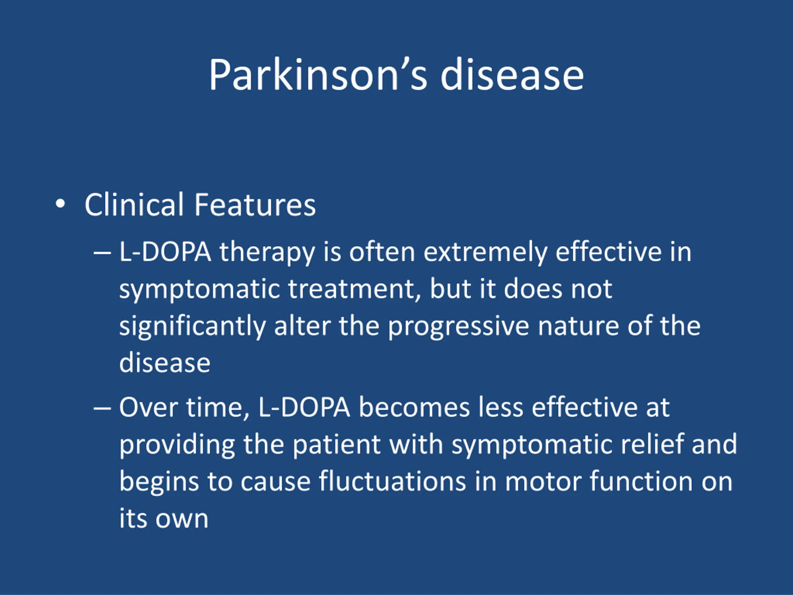 Parkinsons disease Clinical Features L-DOPA therapy is often extremely effective in symptomatic treatment, but it does not significantly alter the progressive nature of the disease Over time, L-DOPA becomes less effective at providing the patient with symptomatic relief and begins to cause fluctuations in motor function on its own