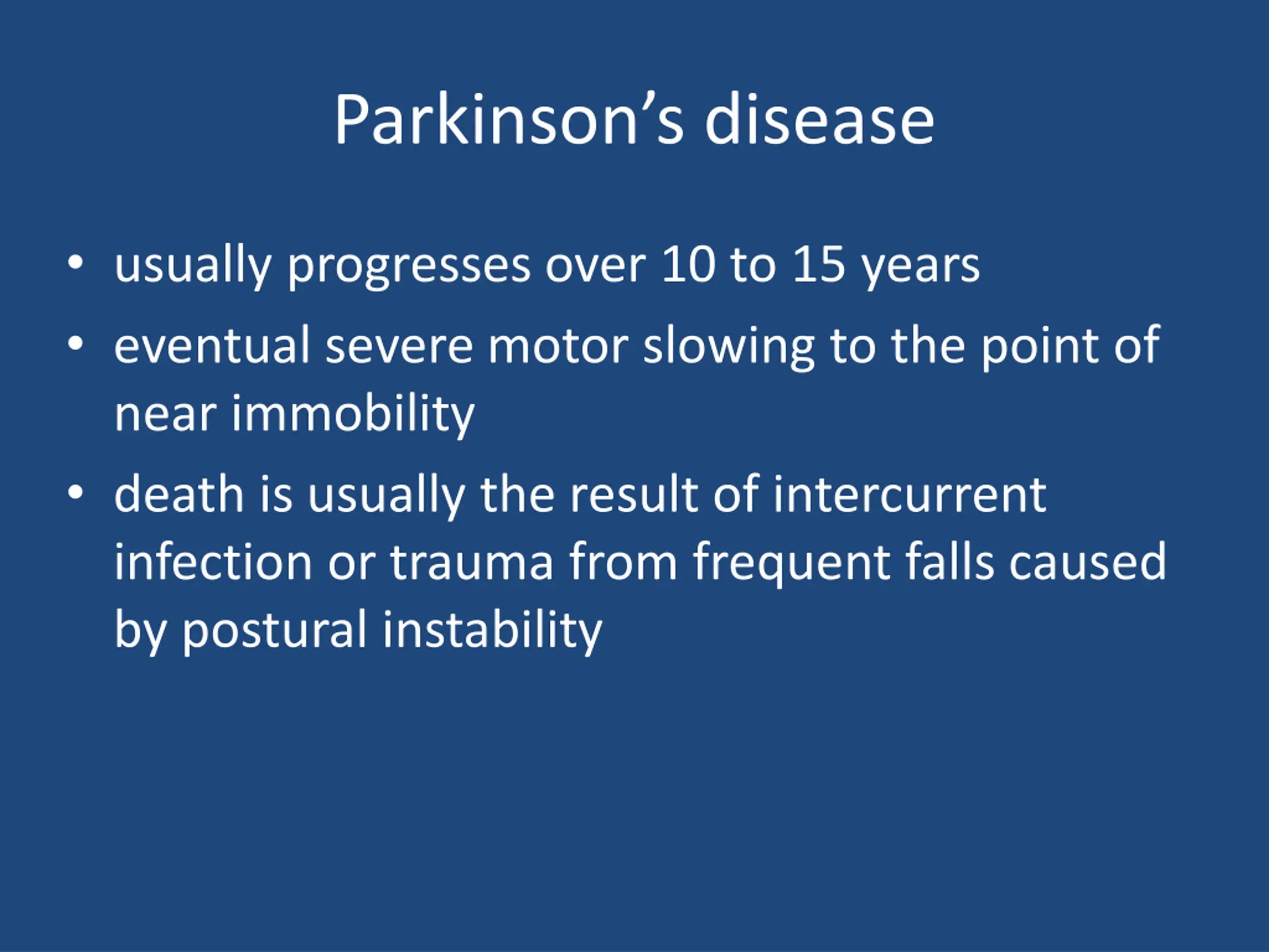 Parkinsons disease usually progresses over 10 to 15 years eventual severe motor slowing to the point of near immobility death is usually the result of intercurrent infection or trauma from frequent falls caused by postural instability