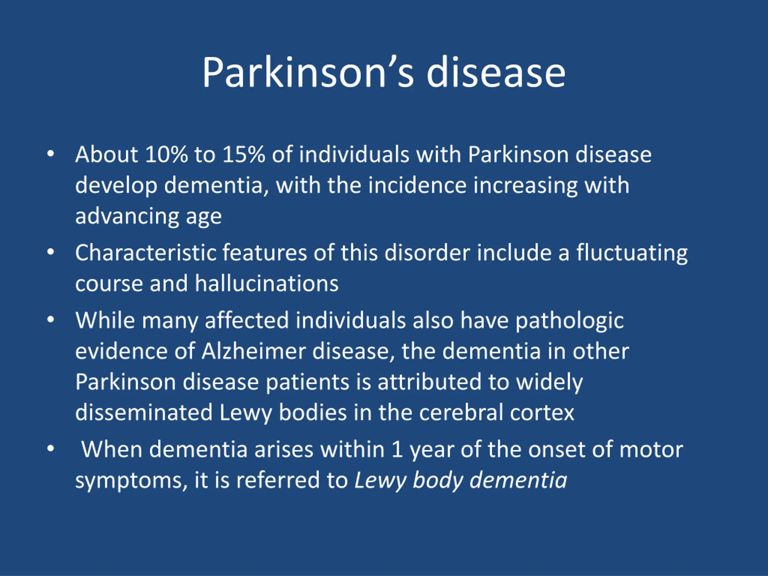 Parkinsons disease About 10% to 15% of individuals with Parkinson disease develop dementia, with the incidence increasing with advancing age Characteristic features of this disorder include a fluctuating course and hallucinations While many affected individuals also have pathologic evidence of Alzheimer disease, the dementia in other Parkinson disease patients is attributed to widely disseminated Lewy bodies in the cerebral cortex When dementia arises within 1 year of the onset of motor symptoms, it is referred to Lewy body dementia