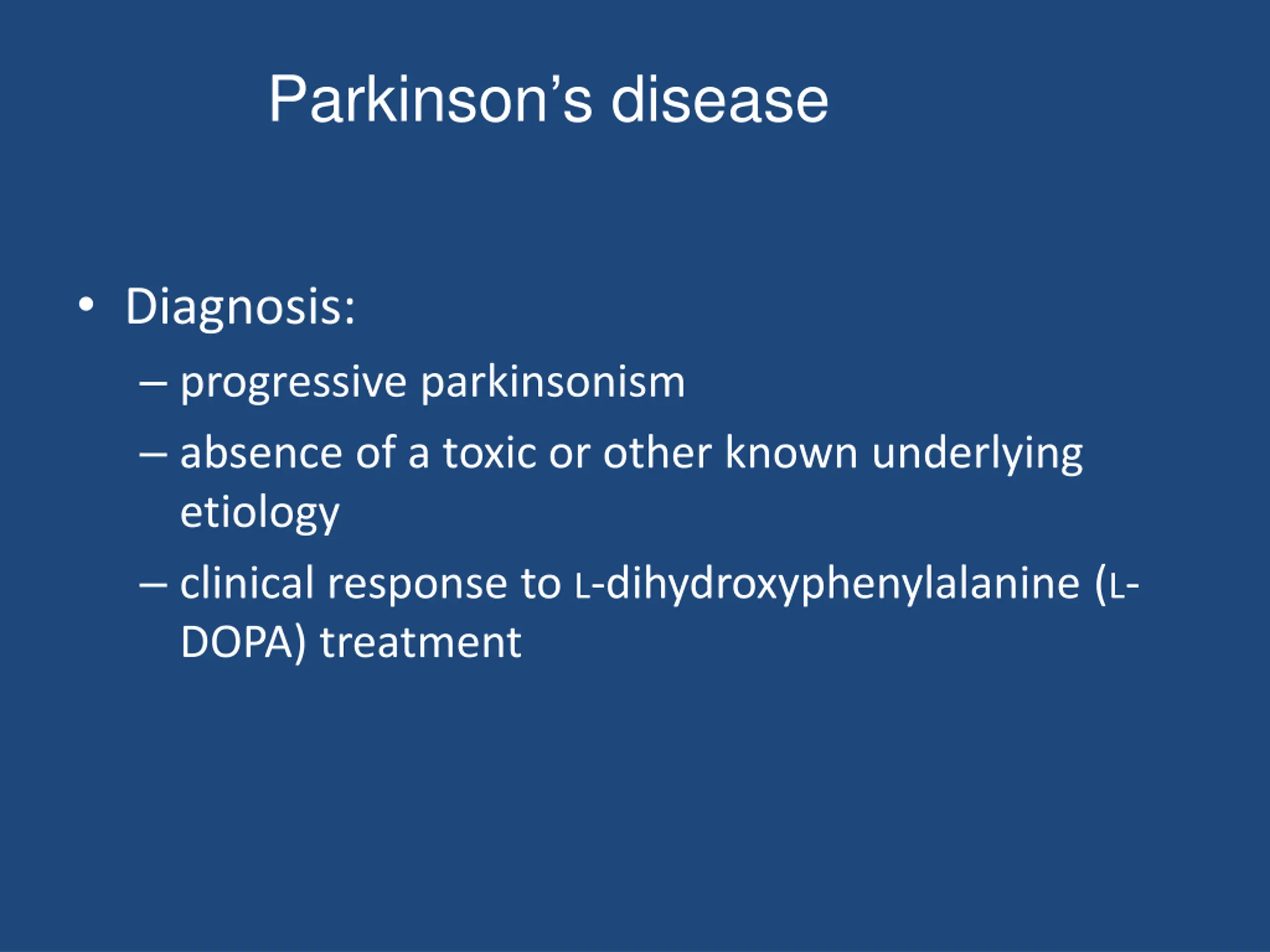 Parkinsons disease Diagnosis: progressive parkinsonism absence of a toxic or other known underlying etiology clinical response to L-dihydroxyphenylalanine (L- DOPA) treatment