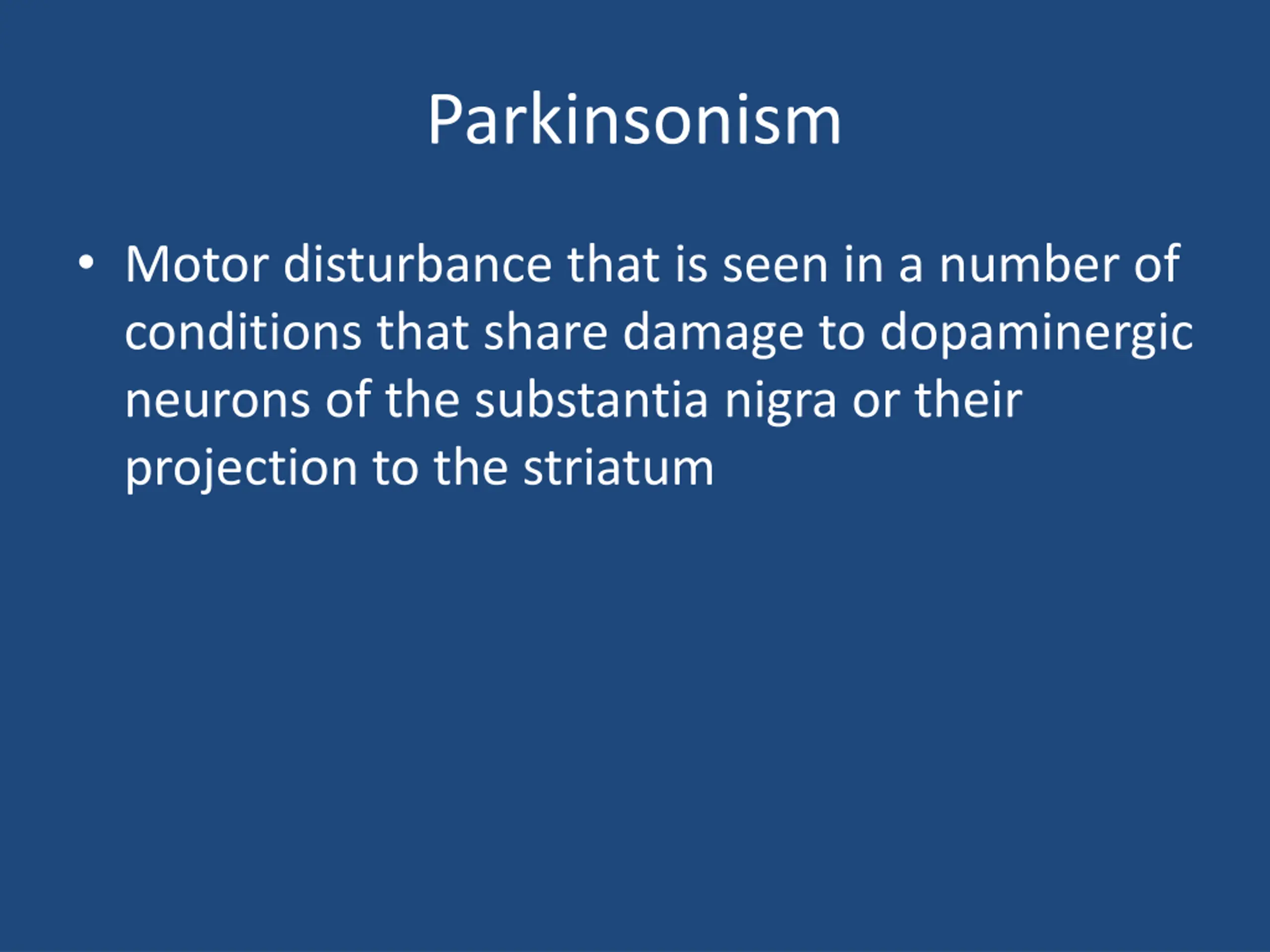 Parkinsonism Motor disturbance that is seen in a number of conditions that share damage to dopaminergic neurons of the substantia nigra or their projection to the striatum