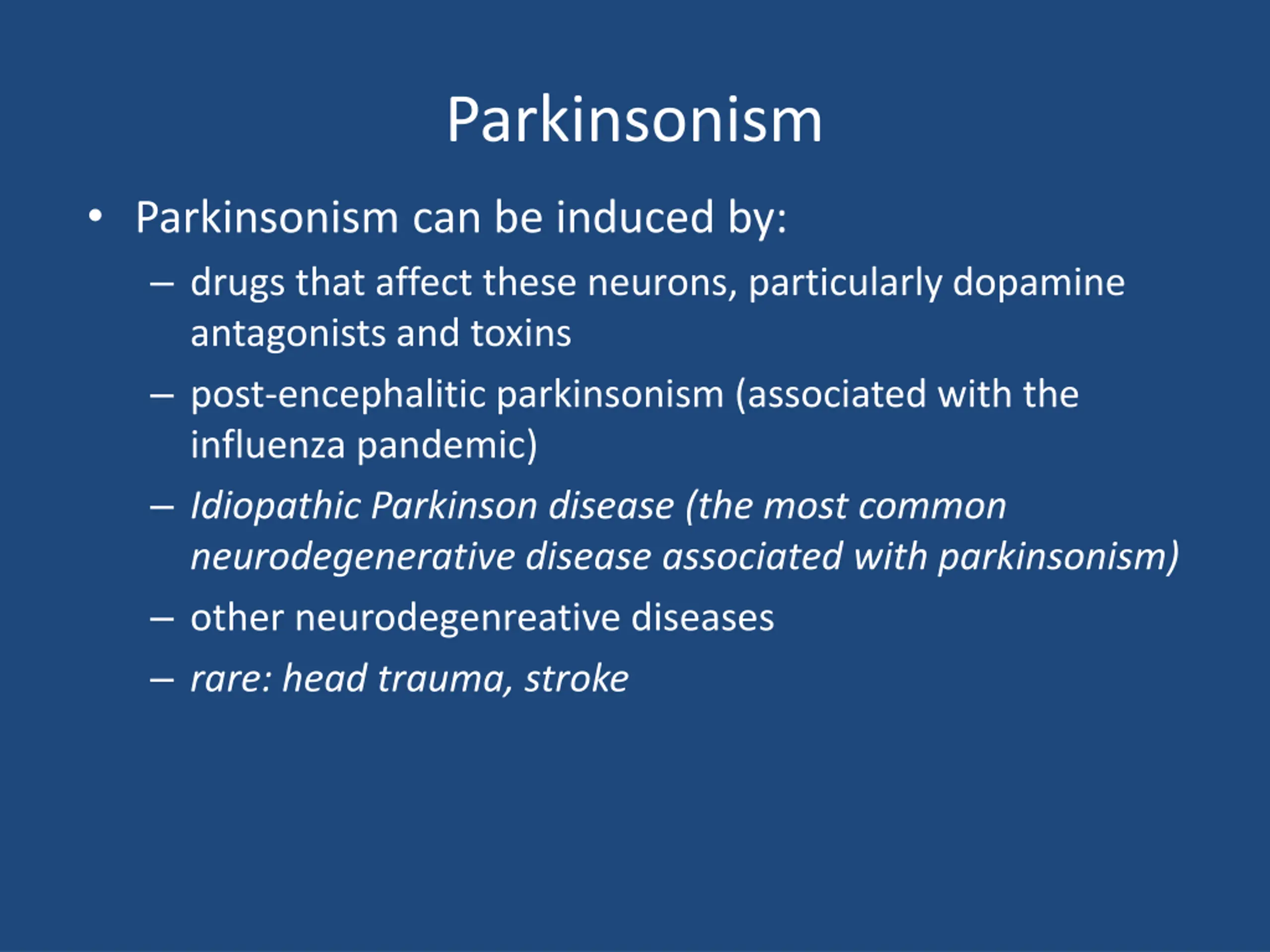 Parkinsonism Parkinsonism can be induced by: drugs that affect these neurons, particularly dopamine antagonists and toxins post-encephalitic parkinsonism (associated with the influenza pandemic) Idiopathic Parkinson disease (the most common neurodegenerative disease associated with parkinsonism) other neurodegenreative diseases rare: head trauma, stroke
