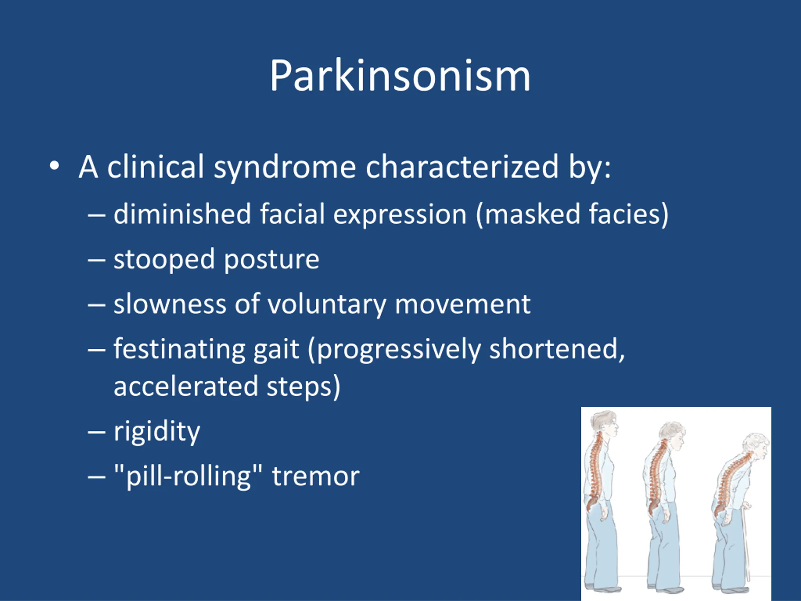 Parkinsonism A clinical syndrome characterized by: diminished facial expression (masked facies) stooped posture slowness of voluntary movement festinating gait (progressively shortened, accelerated steps) rigidity "pill-rolling" tremor