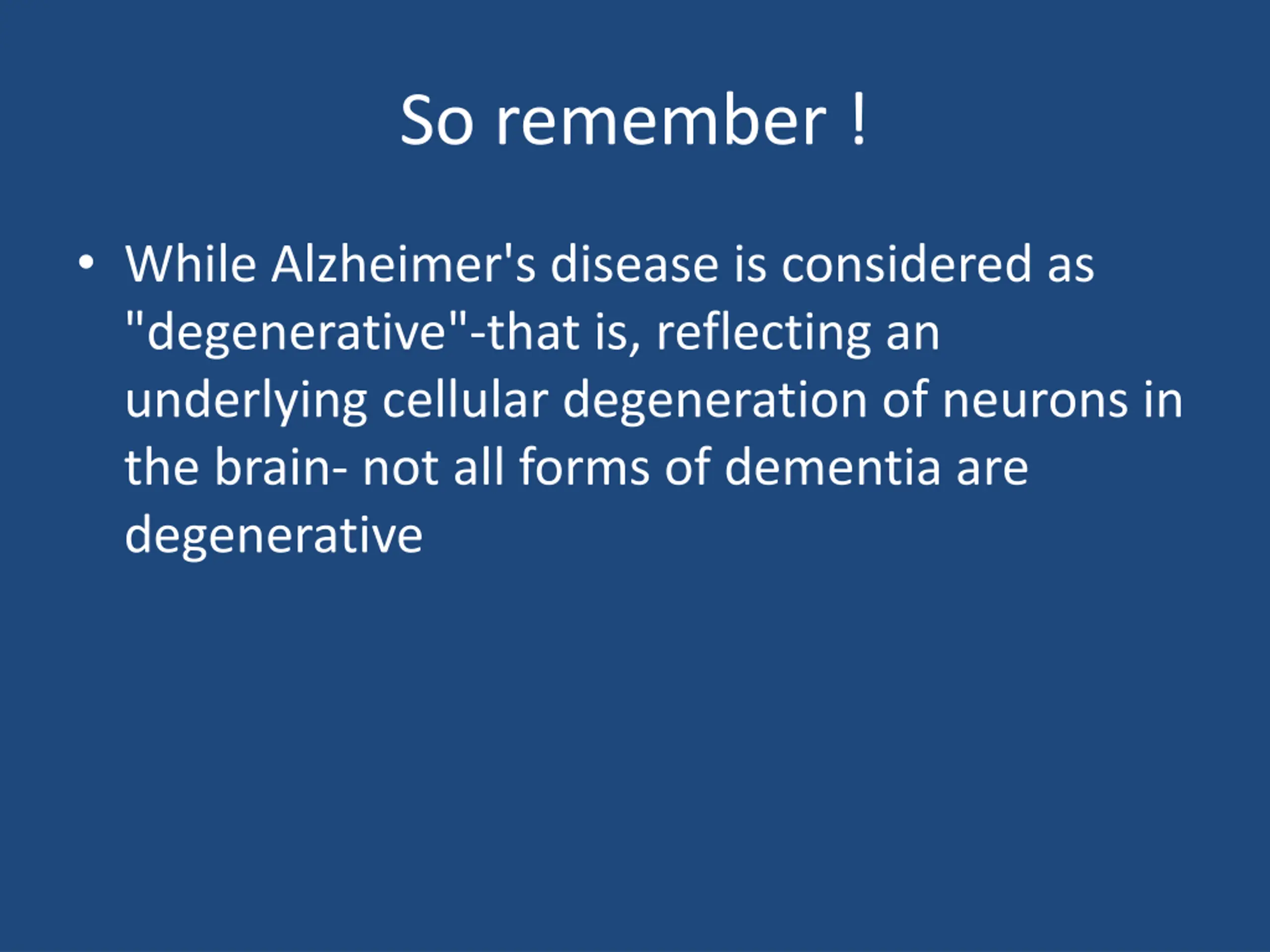 So remember ! While Alzheimer's disease is considered as "degenerative"-that is, reflecting an underlying cellular degeneration of neurons in the brain- not all forms of dementia are degenerative