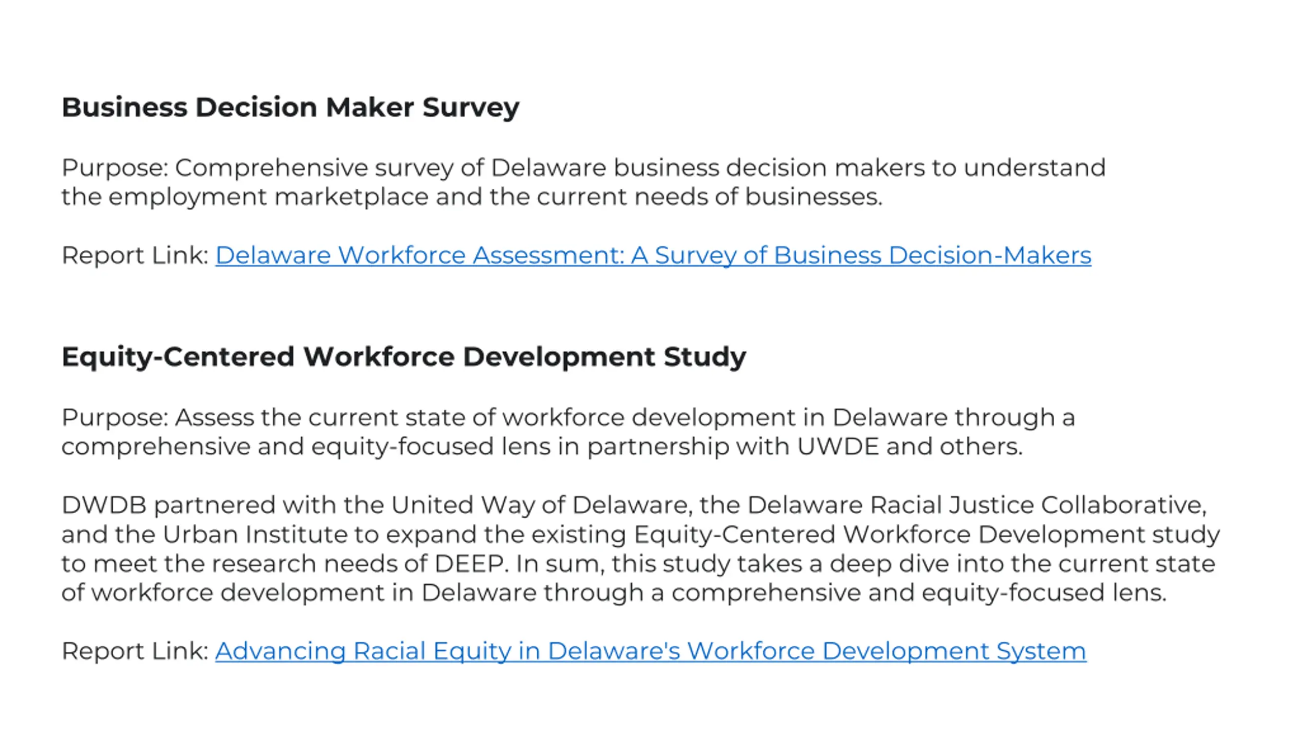 Business Decision Maker Survey Purpose: Comprehensive survey of Delaware business decision makers to understand the employment marketplace and the current needs of businesses. Report Link: Delaware Workforce Assessment: A Survey of Business Decision-Makers Equity-Centered Workforce Development Study Purpose: Assess the current state of workforce development in Delaware through a comprehensive and equity-focused lens in partnership with UWDE and others. DWDB partnered with the United Way of Delaware, the Delaware Racial Justice Collaborative, and the Urban Institute to expand the existing Equity-Centered Workforce Development study to meet the research needs of DEEP. In sum, this study takes a deep dive into the current state of workforce development in Delaware through a comprehensive and equity-focused lens. Report Link: Advancing Racial Equity in Delaware's Workforce Development System